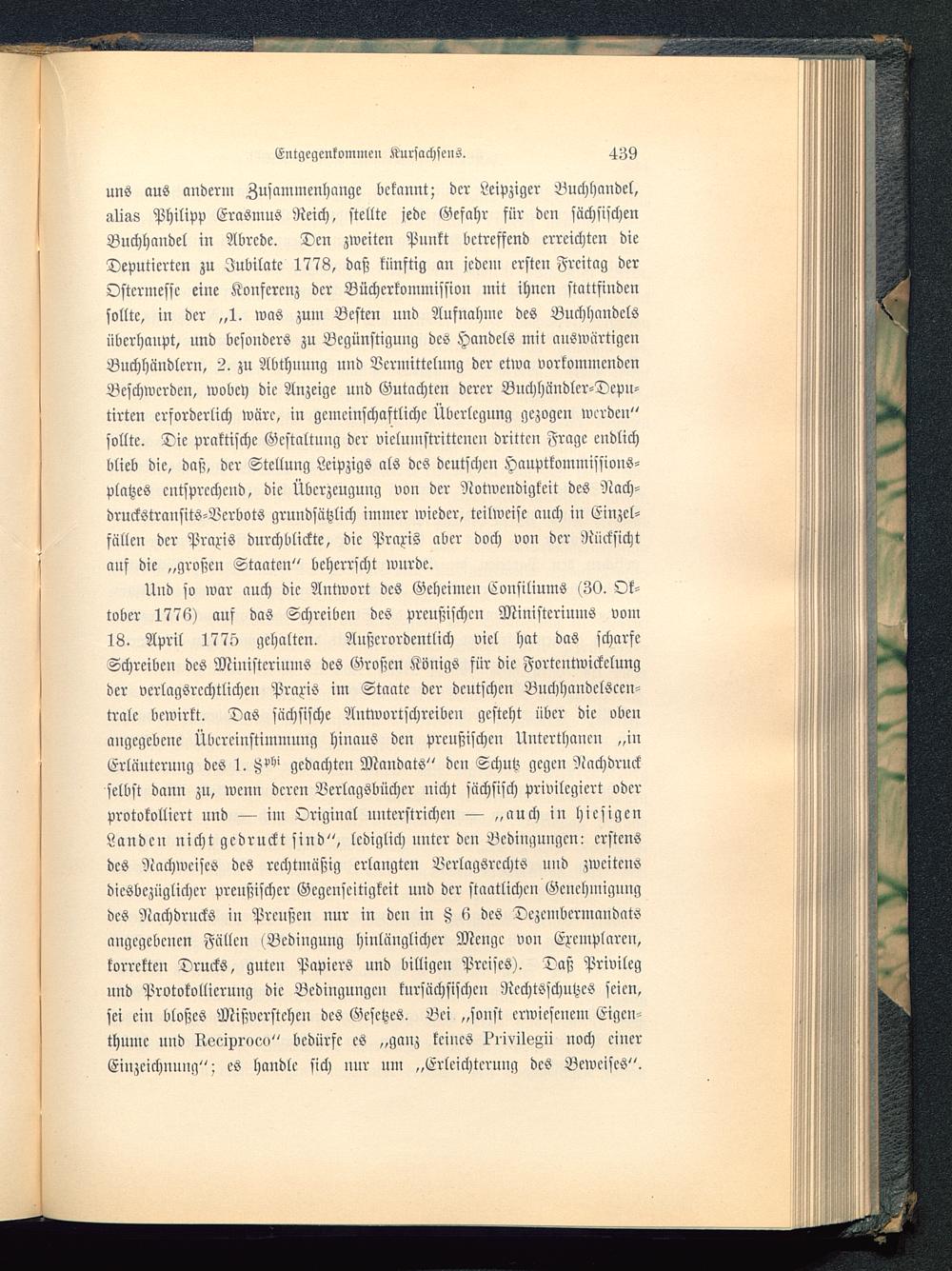 uns aus anderin Zusammenhange bekannt; der Leipziger Buchhandel,alias Philipp Erasmus Reich , stellte jede Gefahr für den sächsischenBuchhandel in Abrede. Den zweiten Punkt betreffend erreichten dieDeputierten zu Judikate 1778, daß künftig an jedem ersten Freitag derOstcrmessc eine Konferenz der Büchcrkommission mit ihnen stattfindensollte, in der „1. was zum Besten und Aufnahme des Buchhandelsüberhaupt, und besonders zu Begünstigung des Handels mit auswärtigenBuchhändlern, 2. zu Abthuung und Bermittelung der etwa vorkommendenBeschwerden, wobcy die Anzeige und Gutachten derer Buchhändler-Depn-tirtcn erforderlich wäre, in gemeinschaftliche Überlegung gezogen werden"sollte. Die praktische Gestaltung der vielumstrittcnen dritten Frage endlichblieb die, daß, der Stellung Leipzigs als des deutschen Hauptkommissions-platzes entsprechend, die Überzeugung von der Notwendigkeit des Nach-druckstransits-Vcrbots grundsätzlich immer wieder, teilweise auch in Einzel-fällen der Praxis durchblickte, die Praxis aber doch von der Rücksichtauf die „großen Staaten" beherrscht wurde.