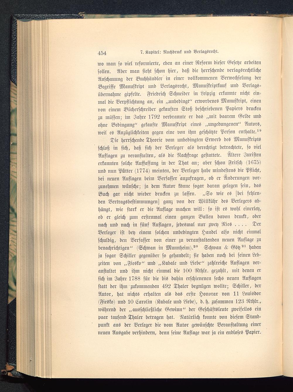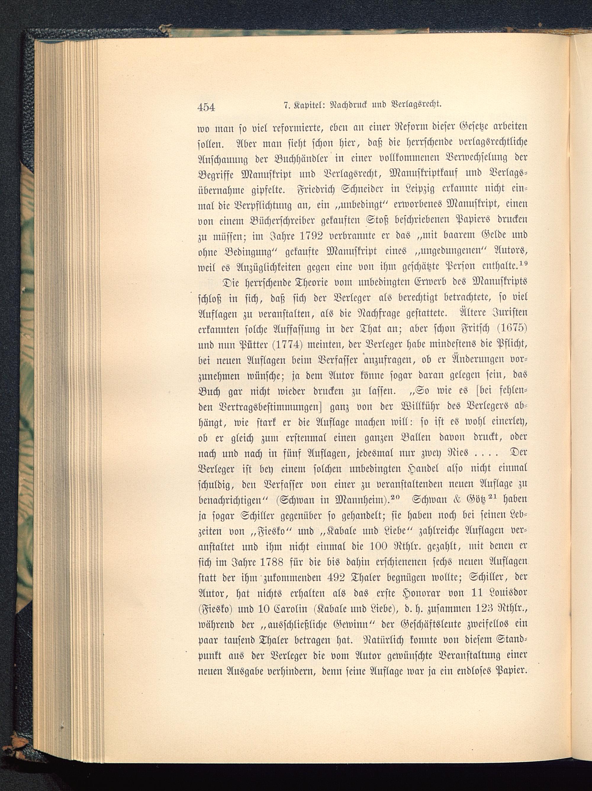 Die herrschende Theorie vom unbedingten Erwerb des Manuskriptsschloß in sich, daß sich der Verleger als berechtigt betrachtete, so vielAuflagen zu veranstalten, als die Nachfrage gestattete. Ältere Juristenerkannten solche Auffassung in der That an; aber schon Fritsch (1675)und nun Pütter (1774) meinten, der Verleger habe mindestens die Pflicht,bei neuen Auslagen beim Verfasser anzufragen, ob er Änderungen vor-zunehmen wünsche; ja dem Autor könne sogar daran gelegen sein, dasBuch gar nicht wieder drucken zu lassen. „So wie es ^vci fehlen-den Vertragsbestimmungen^ ganz von der Willkühr des Verlegers ab-hängt, wie stark er die Auflage machen will: so ist es wohl einerlei),ob er gleich zum erstenmal einen ganzen Ballen davon druckt, odernach und nach in fünf Auflagen, jedesmal nur zwey Nies .... DerVerleger ist bey einem solchen unbedingten Handel also nicht einmalschuldig, den Verfasser von einer zu veranstaltenden neuen Auflage zubenachrichtigen" (Schwan in Mannheim ).^" Schwan Götz^ habenja sogar Schiller gegenüber so gehandelt; sie haben noch bei seinen Leb-zeiten von „Fiesko" und „Kabale und Liebe " zahlreiche Auflagen ver-anstaltet und ihm nicht einmal die lOO Rthlr. gezahlt, mit denen ersich im Jahre 1788 für die bis dahin erschienenen sechs neuen Auflagenstatt der ihm zukommenden 492 Thalcr begnügen wollte; Schiller , derAutor, hat nichts erhalten als das erste Honorar von 11 Louisdor(Fiesko) und 10 Carolin (Kabale und Liebe ), d. h. zusammen 123 Rthlr.,während der „ausschließliche Gewinn" der Geschäftsleute zweifellos einpaar tausend Thaler betragen hat. Natürlich konnte von diesem Stand-punkt aus der Verleger die vom Autor gewünschte Veranstaltung einerneuen Ausgabe verhindern, denn seine Auflage war ja ein endloses Papier.