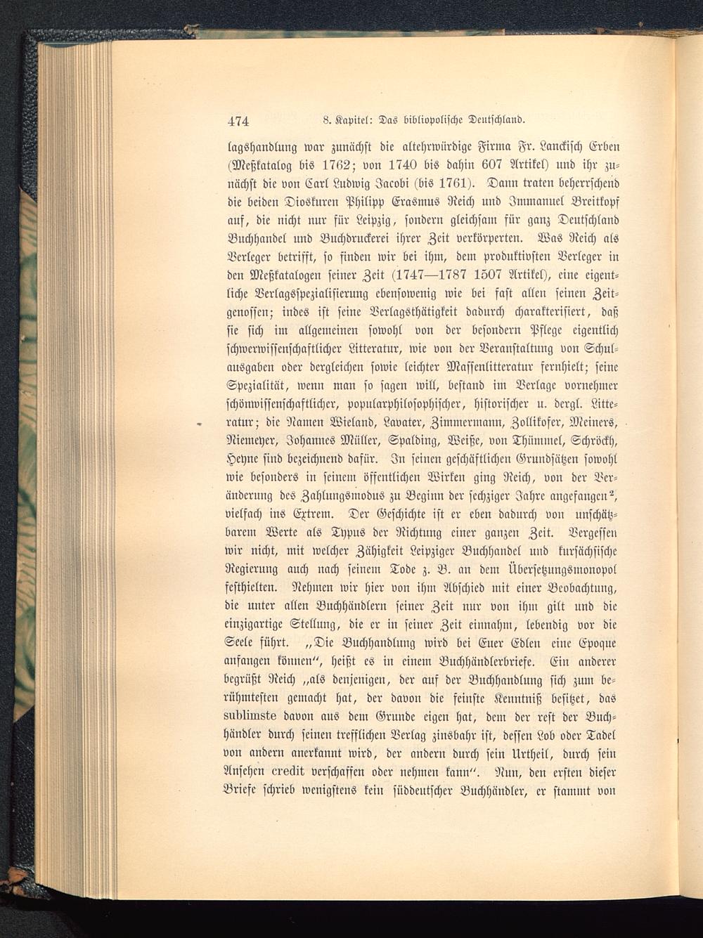 lagshandlung war zunächst die altehrwürdige Firma Fr. Lanckisch ErbenlMeßkatalog bis 1762; von 1740 bis dahin 607 Artikel) und ihr zu-nächst die von Carl Ludwig Jacobi (bis 1761). Dann traten beherrschenddie beiden Dioskuren Philipp Erasmus Reich und Immanuel Breitkopsauf, die nicht nur für Leipzig, sondern gleichsam für ganz Deutschland Buchhandel und Buchdruckerei ihrer Zeit verkörperten. Was Reich alsVerleger betrifft, so finden wir bei ihm, dem produktivsten Verleger inden Meßkatalogen seiner Zeit (1747—1787 1507 Artikel), eine eigent-liche Verlagsspezialisierung ebensowenig wie bei fast allen seinen Zeit-genossen; indes ist seine Verlagsthätigkeit dadurch charakterisiert, daßsie sich im allgemeinen sowohl von der besondern Pflege eigentlichschwcrwisscnschaftlicher Litteratur, wie von der Veranstaltung von Schul-ausgaben oder dergleichen sowie leichter Massenlitteratur fernhielt; seineSpezialität, wenn man so sagen will, bestand im Verlage vornehmerschonwissenschaftlich er, popularphilosophischer, historischer u. dcrgl. Litte-ratur; die Namen Wieland, Lavater , Zimmermann, Zollikofer, Meiners,Niemeyer, Johannes Müller, Spalding, Weiße, von Thümmel, Schröckh,Heyne sind bezeichnend dafür. In seinen geschäftlichen Grundsätzen sowohlwie besonders in seinen? öffentlichen Wirken ging Reich, von der Ver-änderung des Zahlungsmodus zu Beginn der sechziger Jahre angefangen^,vielfach ins Extrem. Der Geschichte ist er eben dadurch von unschätz-barem Werte als Typus der Richtung einer ganzen Zeit. Vergessenwir nicht, mit welcher Zähigkeit Leipziger Buchhandel und kurscichsischcRegierung auch nach seinem Tode z. B. an dem Übersetzungsmonopolfesthielten. Nehmen wir hier von ihm Abschied mit einer Beobachtung,die unter allen Buchhändlern seiner Zeit nur von ihm gilt und dieeinzigartige Stellung, die er in seiner Zeit einnahm, lebendig vor dieSeele führt. „Die Buchhandlung wird bei Euer Edlen eine Epogneanfangen können", heißt es in einem Buchhündlerbriefe. Ein andererbegrüßt Reich „als denjenigen, der auf der Buchhandlung sich zum be-rühmtesten gemacht hat, der davon die feinste Kenntniß besitzet, dassudlimsts davon aus dem Grunde eigen hat, dem der rest der Buch-händler durch seinen trefflichen Verlag zinsbahr ist, dessen Lob oder Tadelvon andern anerkannt wird, der andern durch sein Urtheil, durch seinAnsehen eieclit verschaffen oder nehmen kann". Nun, den ersten dieserBriefe schrieb wenigstens kein süddeutscher Buchhändler, er stammt von