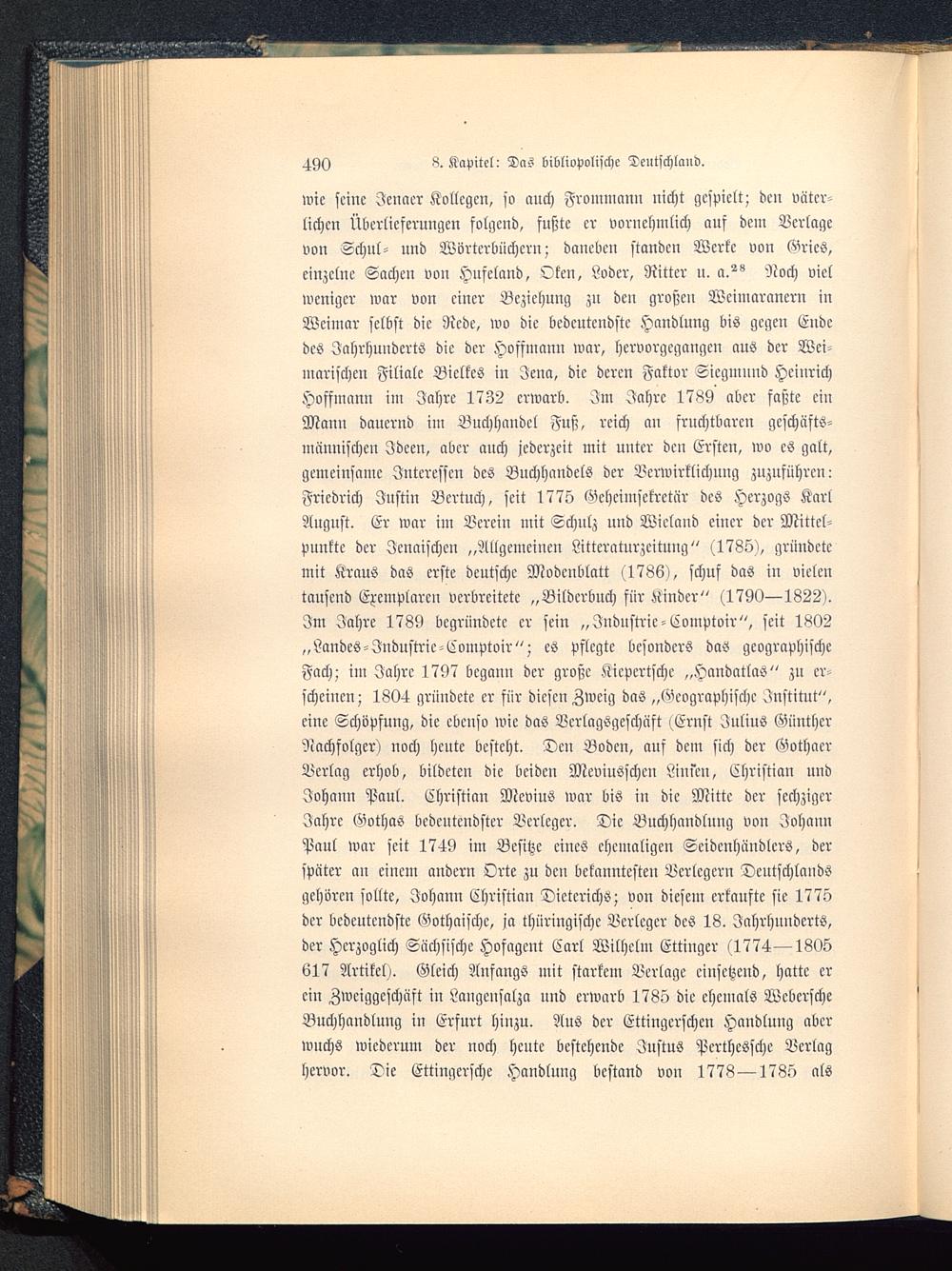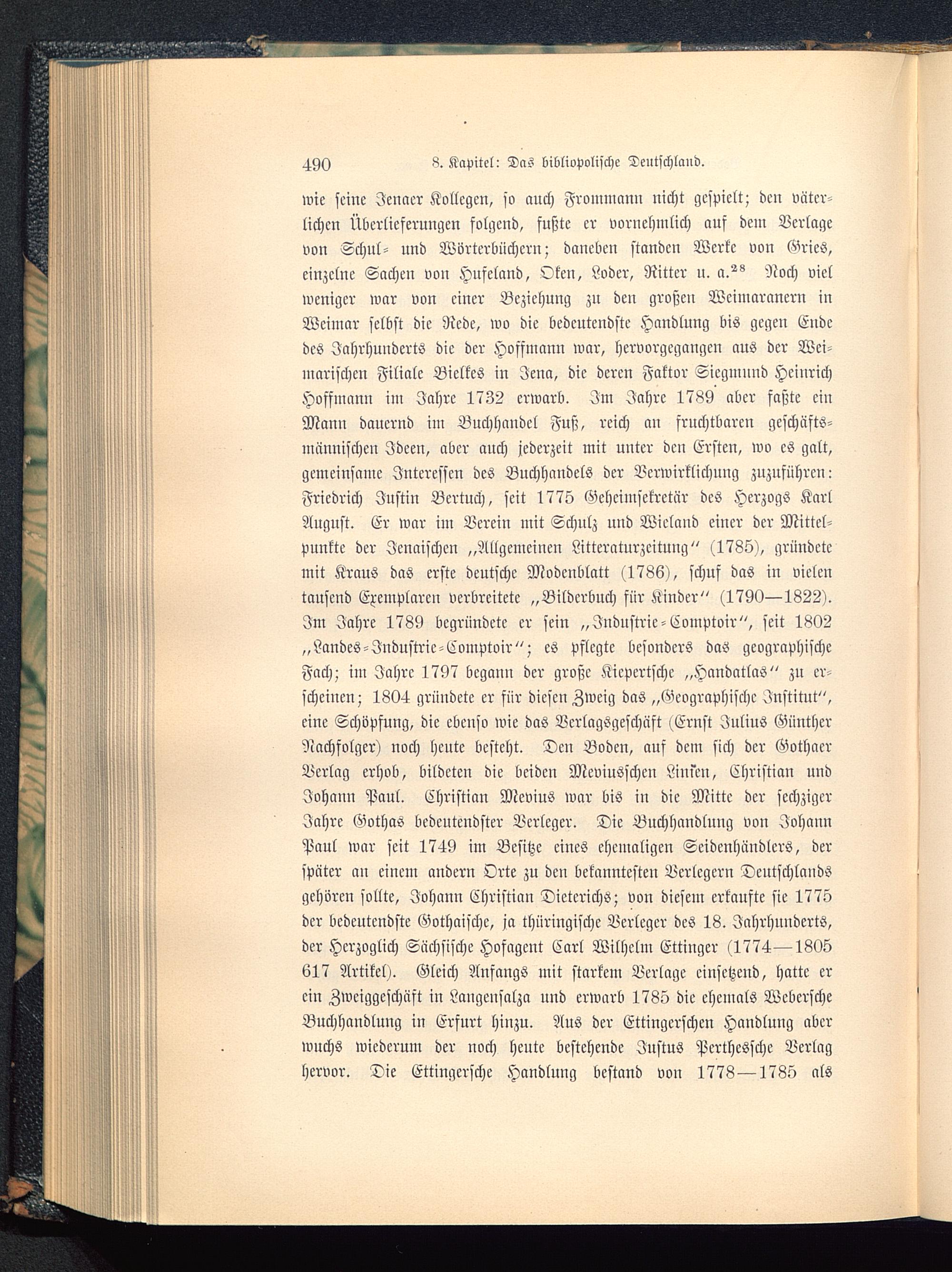 wie seine Jenaer Kollegen, so auch Frommann nicht gespielt; den väter-lichen Überlieferungen folgend, fußte er vornehmlich auf dem Verlagevon Schul- und Wörterbüchern; daneben standen Werke von Gries,einzelne Sachen von Huseland, Oken, Loder, Ritter u. a.^« Noch vielweniger war von einer Beziehung zu den großen Weimaranern inWeimar selbst die Rede, wo die bedeutendste Handlung bis gegen Endedes Jahrhunderts die der Hoffmann war, hervorgegangen aus der Wei-marischen Filiale Melles in Jena, die deren Faktor Sicgmnnd HeinrichHoffmnnn im Jahre 1732 erwarb. Im Jahre 1789 aber faßte einMann dauernd im Buchhandel Fuß, reich an fruchtbaren geschäfts-männischen Ideen, aber auch jederzeit mit unter den Ersten, wo es galt,gemeinsame Interessen des Buchhandels der Verwirklichung zuzuführen:Friedrich Justin Bertuch, seit 1775 Gehcimsekretttr des Herzogs KarlAugust . Er war im Verein mit Schulz und Wicland einer der Mittel-punkte der Jenaischcn „Allgemeinen Litteraturzcitung" (1785), gründetemit Kraus das erste deutsche Modenblatt (1786), schuf das in vielentausend Exemplaren verbreitete „Bilderbuch für Kinder" (1790—1822).Im Jahre 1789 begründete er sein „Industrie-Comptoir", seit 1802„Landes-Industrie-Eomptoir"; es pflegte besonders das geographischeFach; im Jahre 1797 begann der große Kicpertsche „Handatlas" zu er-scheinen; 1804 gründete er für diesen Zweig das „Geographische Institut",eine Schöpfung, die ebenso wie das Verlagögeschäft (Ernst Julius GüntherNachfolger) noch heute besteht. Den Boden, auf dem sich der GothaerVerlag erhob, bildeten die beiden Meviusschen Linien, Christian undJohann Paul. Christian Mevius war bis in die Mitte der sechzigerJahre Gothas bedeutendster Verleger. Die Buchhandlung von JohannPaul war seit 1749 im Besitze eines ehemaligen Seidenhändlcrs, derspäter an einem andern Orte zu den bekanntesten Verlegern Deutschlands gehören sollte, Johann Christian Dietcrichs; von diesem erkaufte sie 1775der bedeutendste Gothaischc, ja thüringische Verleger des 18. Jahrhunderts,der Herzoglich Sächsische Hosagent Carl Wilhelm Ettinger (1774—1805617 Artikel). Gleich Anfangs mit starkem Verlage einsetzend, hatte erein Zweiggeschäft in Langensalza und erwarb 1785 die ehemals WeberscheBuchhandlung in Erfurt hinzu. Aus der Ettingcrschen Handlung aberwuchs wiederum der noch heute bestehende Justus Perthessche Verlaghervor. Die Ettingersche Handlung bestand von 1778—1785 als