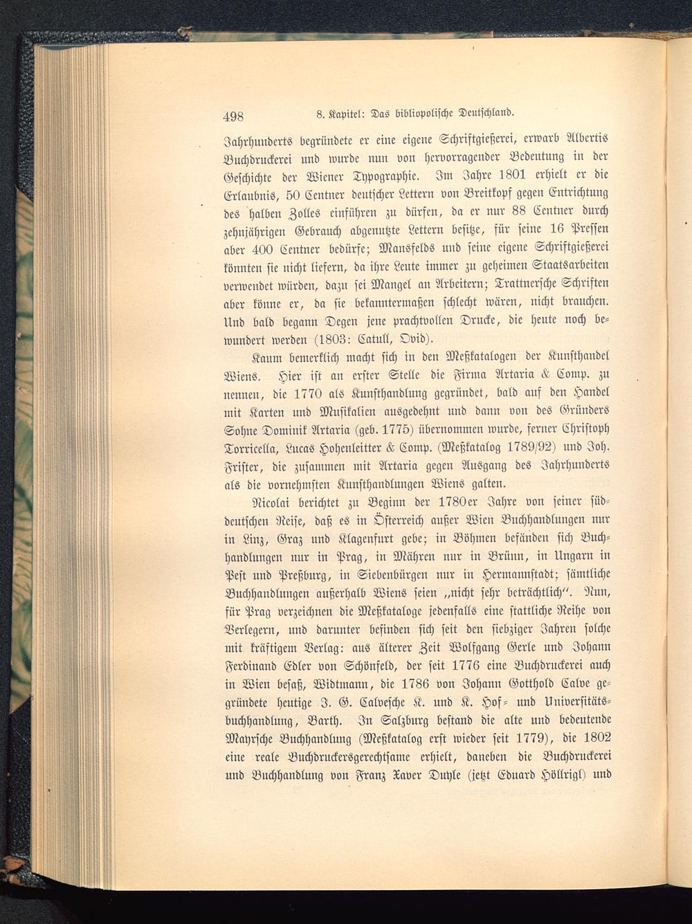 Nicolai berichtet zn Beginn der 1780er Jahre von seiner süd-deutschen Reise, daß es in Österreich außer Wieu Buchhandlungen nurin Linz, Graz und Klagenfurt gebe; in Böhmen befänden sich Buch-handlungen nur in Prag, in Mühren nur in Brüun, in Ungarn inPest und Preßburg, in Siebenbürgen nur in Hcrinannstadt; sämtlicheBuchhandlungen außerhalb Wiens seien „nicht sehr beträchtlich". Nun,für Prag verzeichnen die Mcßkatalogc jedenfalls eine stattliche Reihe vonVerlegern, und darunter befinden sich seit den siebziger Jahren solchemit kräftigem Verlag: aus älterer Zeit Wolfgang Gerle und JohannFerdinand Edler von Schönfeld, der seit 1776 eine Buchdruckerei auchin Wien besaß, Widtmann, die 1786 von Johann Gotthold Calve ge-gründete heutige I. G. Calveschc Ä. und K. Hof- und Univcrsitäts-buchhandlung, Barth. In Salzburg bestand die alte und bedeutendeMayrschc Buchhandlung (Meßkatalog erst wieder seit 1779), die 1802eine reale Buchdruckcrsgercchtsame erhielt, daneben die Buchdruckcreiund Buchhandlung von Franz Xaver Duyle (jetzt Eduard Höllrigl) und