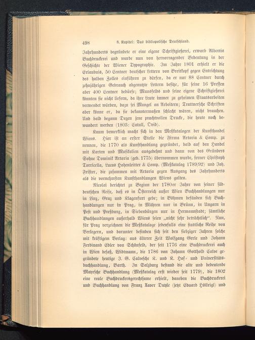 Kaum bemcrklich macht sich in den Meßkatalogcn der KunsthnndclWiens . Hier ist an erster Stelle die Firma Artaria Comp, zunennen, die 1770 als Kunsthandlung gegründet, bald auf den Handelmit Karten und Musikalien ausgedehnt und dann von des GründersSohne Dominik Artaria (geb. 1775) übernommen wurde, ferner ChristophTorricella, Lucas Hohenleitter <d Comp. (Mcßkatalog 1789/92) und Joh.Frister, die zusammen mit Artaria gegen Ausgang des Jahrhundertsals die vornehmsten Kunsthandlungen Wiens galten.
