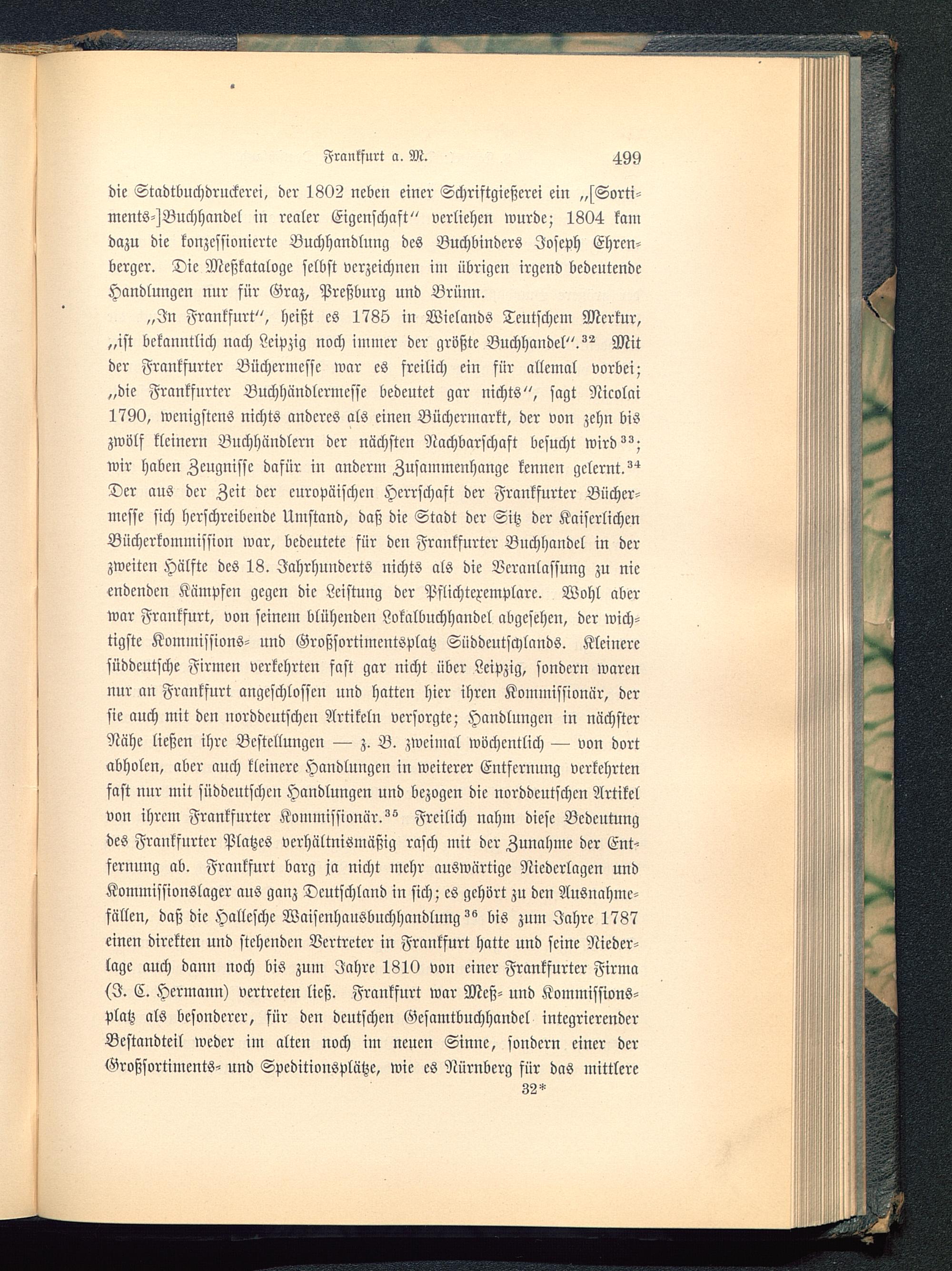 „In Frankfurt ", heißt es 1785 in Wielands Teutschem Merkur,„ist bekanntlich nach Leipzig noch immer der größte Buchhandel".^ Mitder Frankfurter Büchermcsse war es freilich ein für allemal vorbei;„die Frankfurter Buchhändlermesse bedeutet gar nichts", sagt Nicolai1790, wenigstens nichts anderes als einen Büchermarkt, der von zehn biszwölf klcinern Buchhändlern der nächsten Nachbarschaft besucht wird^;wir haben Zeugnisse dafür in andcrm Zusammenhange kennen gelernt.^Der aus der Zeit der europäischen Herrschaft der Frankfurter Bücher-mcsse sich herschrcibcnde Umstand, daß die Stadt der Sitz der KaiserlichenBlicherkommission war, bedeutete für den Frankfurter Buchhandel in derzweiten Hälfte des 18. Jahrhunderts nichts als die Veranlassung zu nieendenden Kämpfen gegen die Leistung der Pflichtexemplare. Wohl aberwar Frankfurt , von seinein blühenden Lokalbuchhandel abgesehen, der wich-tigste Kommissions- und Großsortimentsplatz Süddeutschlands . Kleineresüddeutsche Firmen verkehrten fast gar nicht über Leipzig , sondern warennur an Frankfurt angeschlossen und hatten hier ihren Kommissionär, dersie auch mit den norddeutschen Artikeln versorgte; Handlungen in nächsterNähe ließen ihre Bestellungen — z. B. zweimal wöchentlich — von dortabholen, aber auch kleinere Handlungen in weiterer Entfernung verkehrtenfast nur mit süddeutschen Handlungen und bezogen die norddeutschen Artikelvon ihrem Frankfurter Kommissionär.^ Freilich nahm diese Bedeutungdes Frankfurter Platzes verhältnismäßig rasch mit der Zunahme der Ent-fernung ab. Frankfurt barg ja nicht mehr auswärtige Niederlagen undKommissionslager aus ganz Deutschland in sich; es gehört zu den Ausnahme-fällen, daß die Hallesche Waisenhausbuchhandlung ^ bis zum Jahre 1787einen direkten und stehenden Vertreter in Frankfurt hatte und seine Nieder-lage auch dann noch bis zum Jahre 1810 von einer Frankfurter Firma(I. C. Hermann) vertreten ließ. Frankfurt war Meß- und Kommissions-platz als besonderer, für den deutschen Gesamtbuchhandel integrierenderBestandteil weder im alten noch im neuen Sinne, sondern einer der