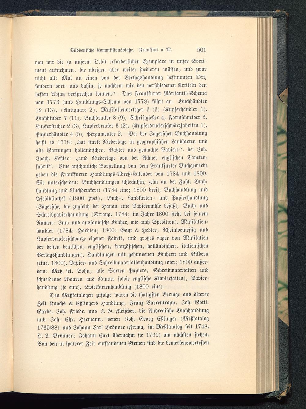 Den Meßkatalogcn zufolge waren die thätigstcn Verlage aus ältererZeit Knochs Eßlingcrs Handlung, Franz Varrentrapp , Joh. Gottl.Garbe, Joh. Friedr. und I. G. Fleischer, die Andreäische Buchhandlungund Joh. Chr. Hermann, denen Joh. Georg Eßlinger (Meßkatalog1765/88) und Johann Carl Brönner (Firma, im Meßkatalog seit 1748,H. L. Brönner; Johann Carl übernahm sie 1761) am nächsten stehen.Von den in späterer Zeit entstandenen Firmen sind die bemerkenswertesten