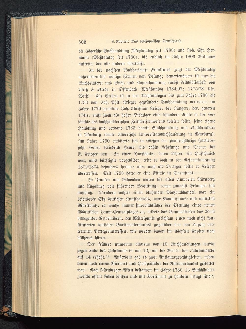 In Franken und Schwaben waren die alten Cmporien Nürnberg und Augsburg vou führender Bedeutung, denen zunächst Erlangen sichanschloß. Nürnberg nährte einen blühenden Platzbuchhandel, war einbesonderer Sitz deutschen Kunsthandels, war Kommissions- und natürlichMarktplatz, es wuchs immer Zuversichtlicher der Stellung eines neuensüddeutschen Haupt-Centralplatzes zu, bildete das Sammelbecken das Reichbewegender Reformideen, den Mittelpunkt gleichsam eines noch nicht kon-stituierten deutschen Sortimcnterbuudes gegenüber den von Leipzig ver-tretenen Verlegerinteressen; wir werden davon im nächste» Kapitel nochNäheres hören.