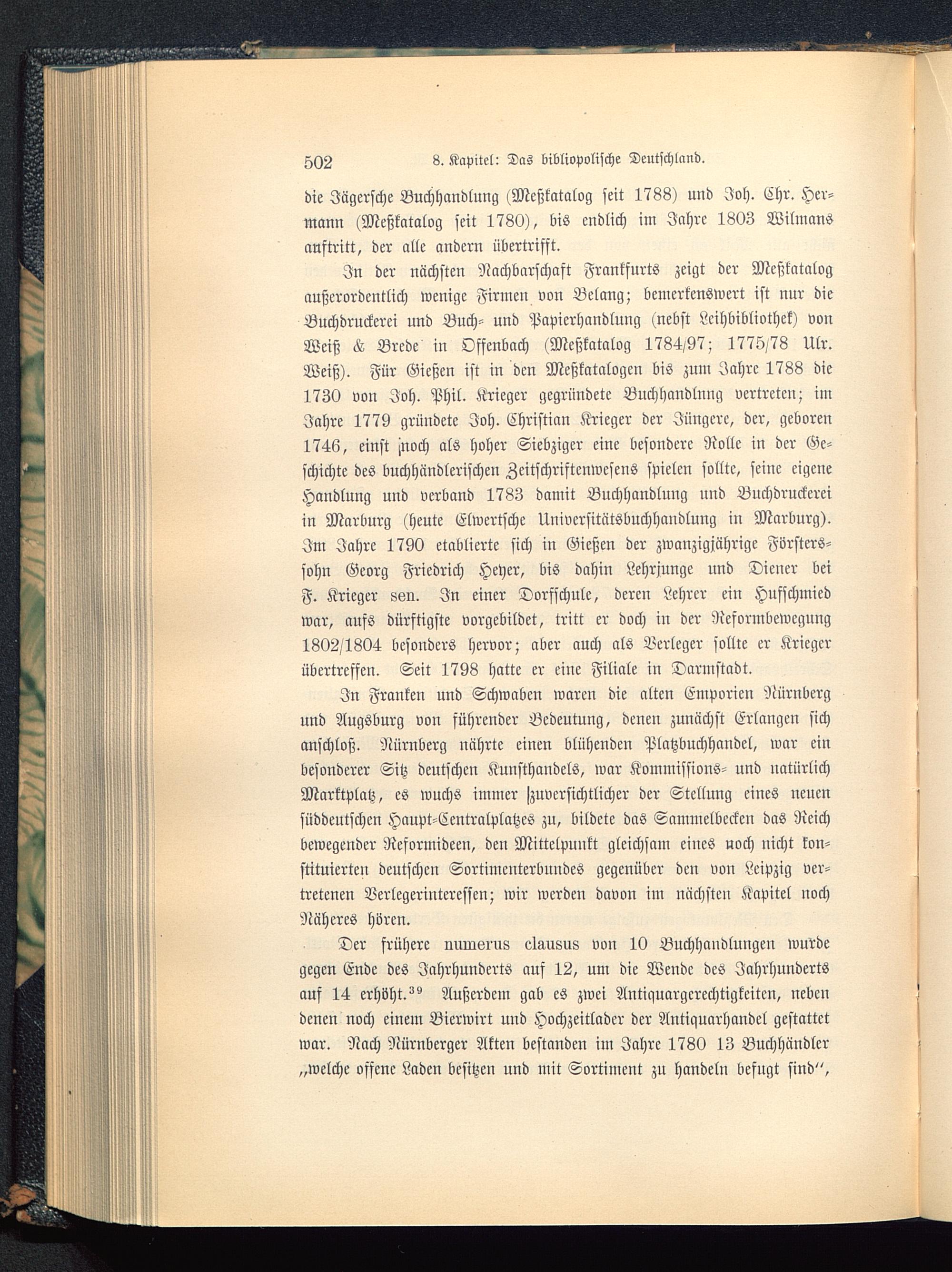 Der frühere numerus clausus von 10 Buchhandlungen wurdegegen Ende des Jahrhunderts auf 12, um die Wende des Jahrhundertsauf 14 erhöht.^ Außerdem gab es zwei Antiquargcrechtigkcitcn, nebendenen noch einem Bierwirt und Hochzeitladcr der Antiauarhandel gestattetwar. Nach Nürnberger Akten bestanden im Jahre 1780 13 Buchhändler„welche offene Laden besitzen und mit Sortiment zu handeln befugt sind".