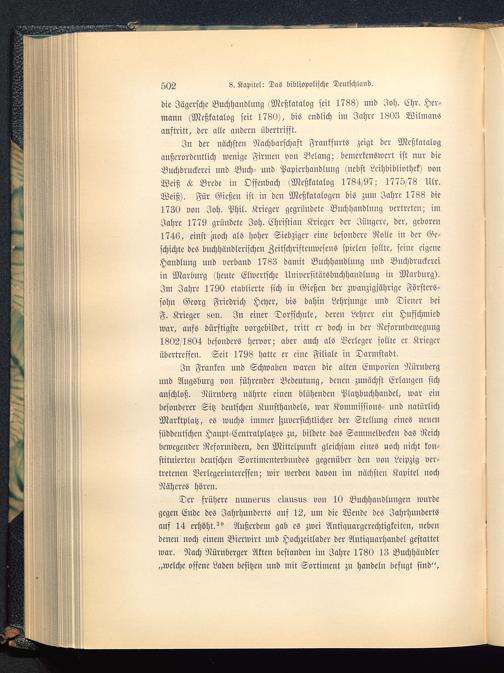 In der nächsten Nachbarschaft Frankfurts zeigt der Meßkatalogaußerordentlich wenige Firmen von Belaug; bemerkenswert ist nur dieBuchdruckern und Buch- und Papierhandlung (nebst Leihbibliothek) vonWeiß Ä Brede in Offenbach (Meßkatalog 1784/97; 1775/78 Ulr.Weiß). Für Gießen ist in den Meßkatalogen bis zum Jahre 1788 die1730 von Joh. Phil. Krieger gegründete Buchhandlung vertreten; imJahre 1779 gründete Joh. Christian Krieger der Jüngere, der, geboren1746, einst ^noch als hoher Siebziger eine besondere Rolle in der Ge-schichte des buchhalterischen Zeitschriftcnwcsens spielen sollte, seine eigeneHandlung und verband 1783 damit Buchhandlung und Buchdruckernin Marburg (heute Clwertsche Univcrsitätsbuchhandlung iu Marburg ).Im Jahre 1790 etablierte sich in Gießen der zwanzigjährige Försters-sohn Georg Friedrich Heyer, bis dahin Lehrjunge und Diener beiF. Krieger ssii. In einer Dorfschule, deren Lehrer ein Hufschmiedwar, aufs dürstigste vorgebildet, tritt er doch in der Neformbewcgung1802/1804 besonders hervor; aber auch als Verleger sollte er Kriegerübertreffen. Seit 1798 hatte er eine Filiale in Darmstadt .