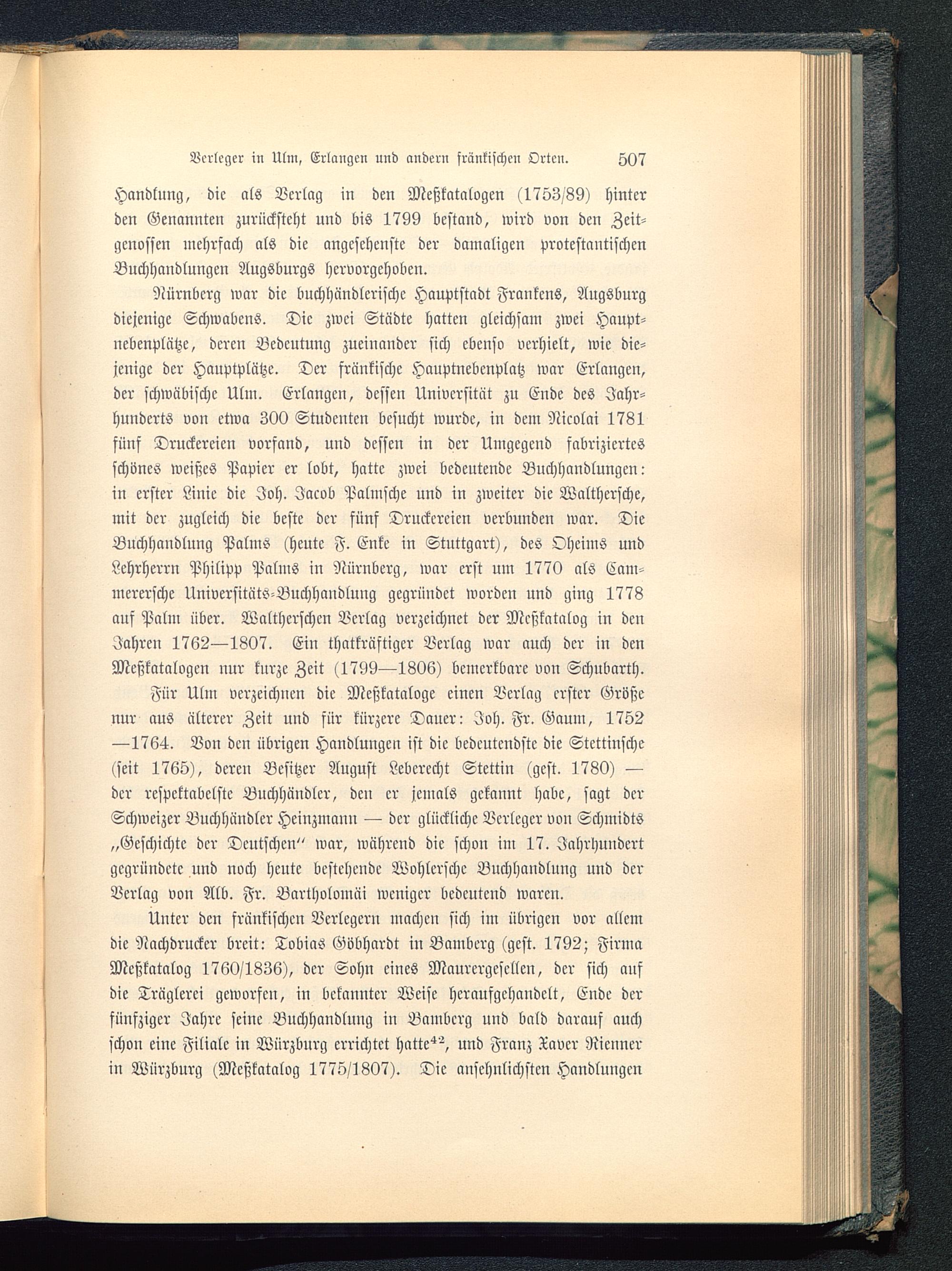 Nürnberg war die buchhändlcrischc Hauptstadt Frankens, Augsburg diejenige Schwabens . Die zwei Städte hatten gleichsam zwei Haupt-nebenplätze, deren Bedeutung zueinander sich ebenso verhielt, wie die-jenige der Hauptplätze. Der fränkische Hauptnebcnplatz war Erlangen ,der schwäbische Ulm. Erlangen , dessen Universität zu Ende des Jahr-hunderts von etwa 300 Studenten besucht wurde, in dem Nicolai 1781fünf Druckereien vorfand, und dessen in der Umgegend fabriziertesschönes weißes Papier er lobt, hatte zwei bedeutende Buchhandlungen:in erster Linie die Joh. Jacob Palmsche und in zweiter die Walthersche,mit der zugleich die beste der fünf Druckereien verbunden war. DieBuchhandlung Palms (heute F. Enke in Stuttgart ), des Oheims undLehrherrn Philipp Palms in Nürnberg , war erst um 1770 als Cam-merersche Universitüts-Buchhandlung gegründet worden und ging 1778auf Palm über. Walterschen Verlag verzeichnet der Mcßkatalog in denJahren 1762—1807. Ein tatkräftiger Verlag war auch der in denMeßkatalogen nur kurze Zeit (1799—1806) bemerkbare von Schubarth.