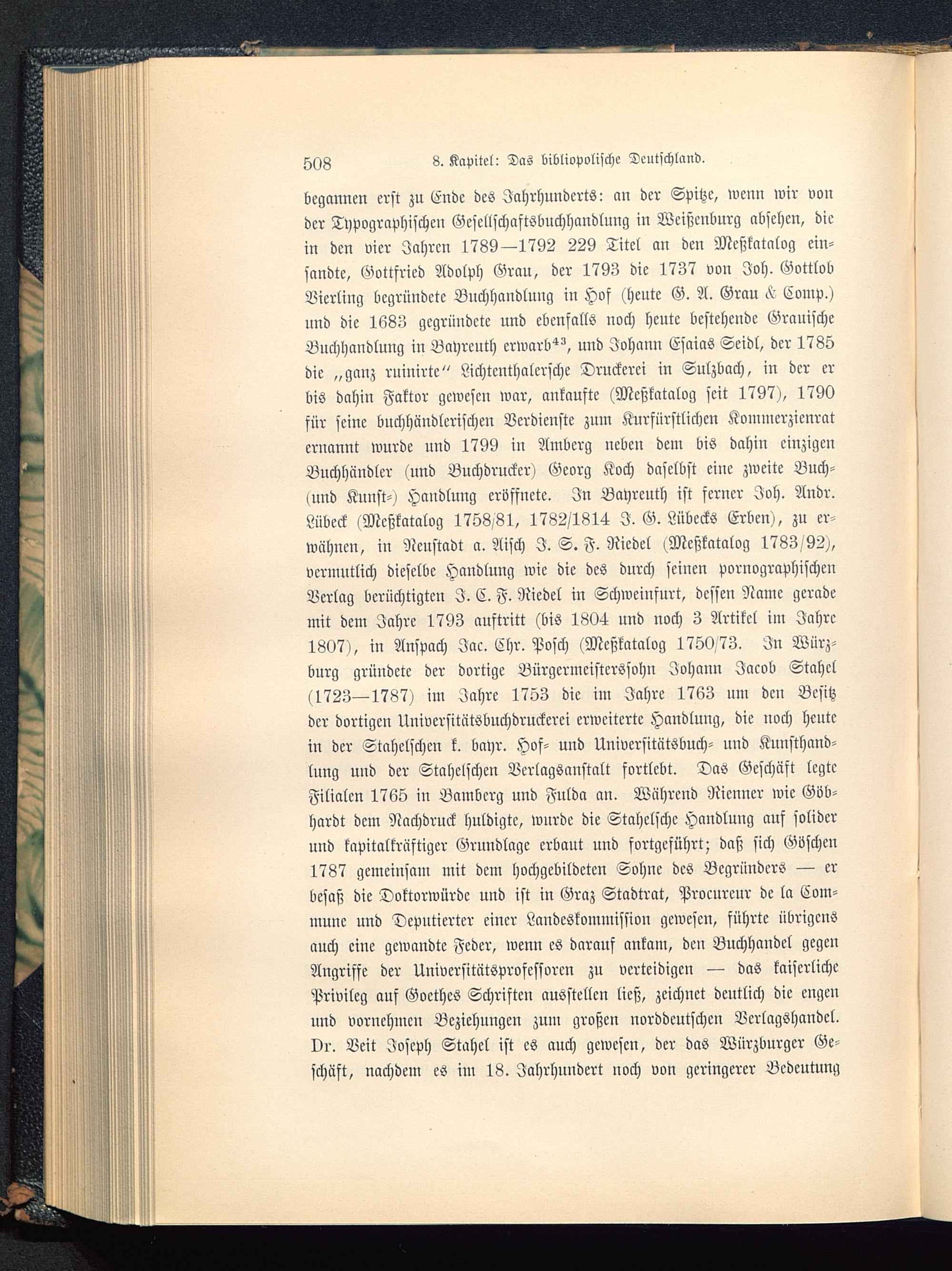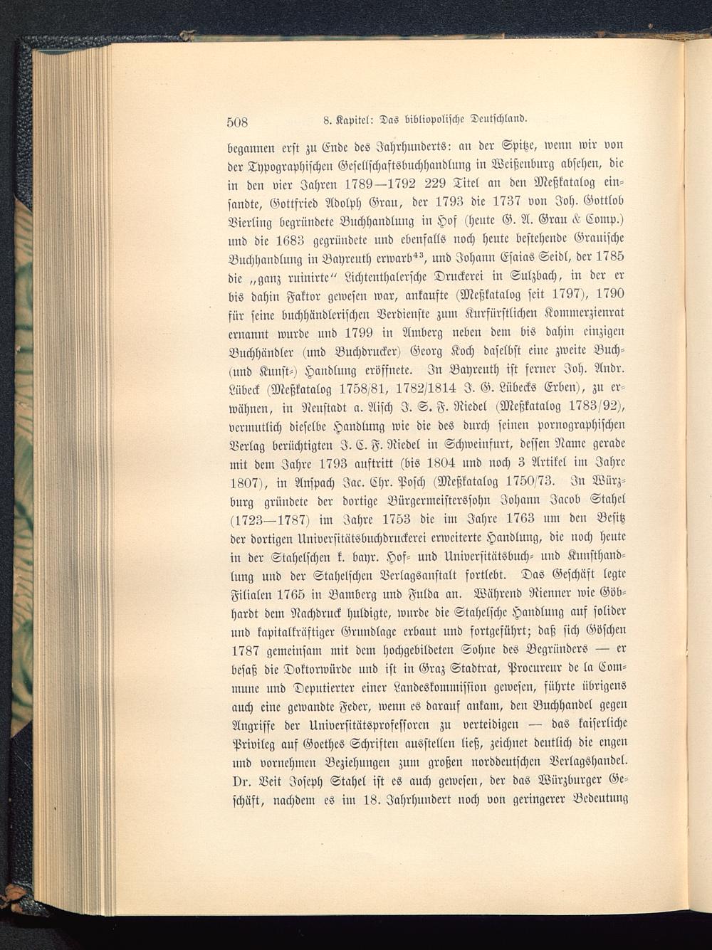 begannen erst zu Ende des Jahrhunderts: an der Spitze, wenn wir vonder Typographischen Gescltschaftsbuchhandlung in Wcißcnburg absehen, diein den vier Jahren 1789—1792 229 Titel an den Meßkatalog ein-sandte, Gottfried Adolph Grau, der 1793 die 1737 von Joh. GottlobMeiling begründete Buchhandlung in Hof (heute G. A. Grau ^ Comp.)und die 1683 gegründete und ebenfalls noch heute bestehende GrauischeBuchhandlung in Bayreuth erwarb^, und Johann Esaias Seidl, der 1785die „gauz ruinirte" Lichtenthalcrsche Druckerei in Sulzbach, in der erbis dahin Faktor gewesen war, ankaufte (Meßkatalog seit 1797), 1790für seine buchhändlerischen Verdienste zum Kurfürstlichen Kommcrzienraternannt wurde und 1799 in Amberg neben dem bis dahin einzigenBuchhändler (und Buchdrucker) Georg Koch daselbst eine zweite Buch-<und Kunst-) Handlung eröffnete. In Bayreuth ist ferner Joh. Andr.Lübeck (Meßkatalog 1758/81, 1782/1814 I. G. Lübecks Erben), zu er-wähnen, in Neustadt a. Aisch I. S. F. Riedel (Meßkatalog 1783/92),vermutlich dieselbe Handlung wie die des durch seinen pornographischenVerlag berüchtigten I. C. F. Riedel in Schweinfurt , dessen Name gerademit dem Jahre 1793 auftritt (bis 1804 und noch 3 Artikel im Jahre1807), in Anspach Jac. Chr. Posch (Meßkatalog 1750.73. In Würz-burg gründete der dortige Bürgermcistcrssohn Johann Jacob Stechet(1723—1787) im Jahre 1753 die im Jahre 1763 um den Besitzder dortigen Universitätsbuchdruckcrei erweiterte Handlung, die noch heutein der Stcchelschen k. bayr. Hof- und Universitätsbuch- und Kunsthand-lung und der Stcchelschen Verlagsanstalt fortlebt. Das Geschäft legteFilialen 1765 in Bamberg und Fulda an. Während Nicnner wie Göb-hardt dem Nachdruck huldigte, wurde die Stahclsche Handlung auf soliderund kapitalkräftiger Grundlage erbaut und fortgeführt; daß sich Göschen1787 gemeinsam mit dem hochgebildeten Sohne des Begründers — erbesaß die Doktorwürde und ist in Graz Stadtrat, Procurcur de la Com-mune und Deputierter einer Landeskommission gewesen, führte übrigensauch eine gewandte Feder, wenn es darauf ankam, den Buchhandel gegenAngriffe der Universitätsprofessorcn zu verteidigen — das kaiserlichePrivileg auf Goethes Schriften ausstellen ließ, zeichnet deutlich die cngcuund vornehmen Beziehungen zum großen norddeutschen Verlagshandcl.vr. Veit Joseph Stahcl ist es auch gewesen, der das Würzburger Ge-schäft, nachdem es im 18. Jahrhundert noch von geringerer Bedeutung