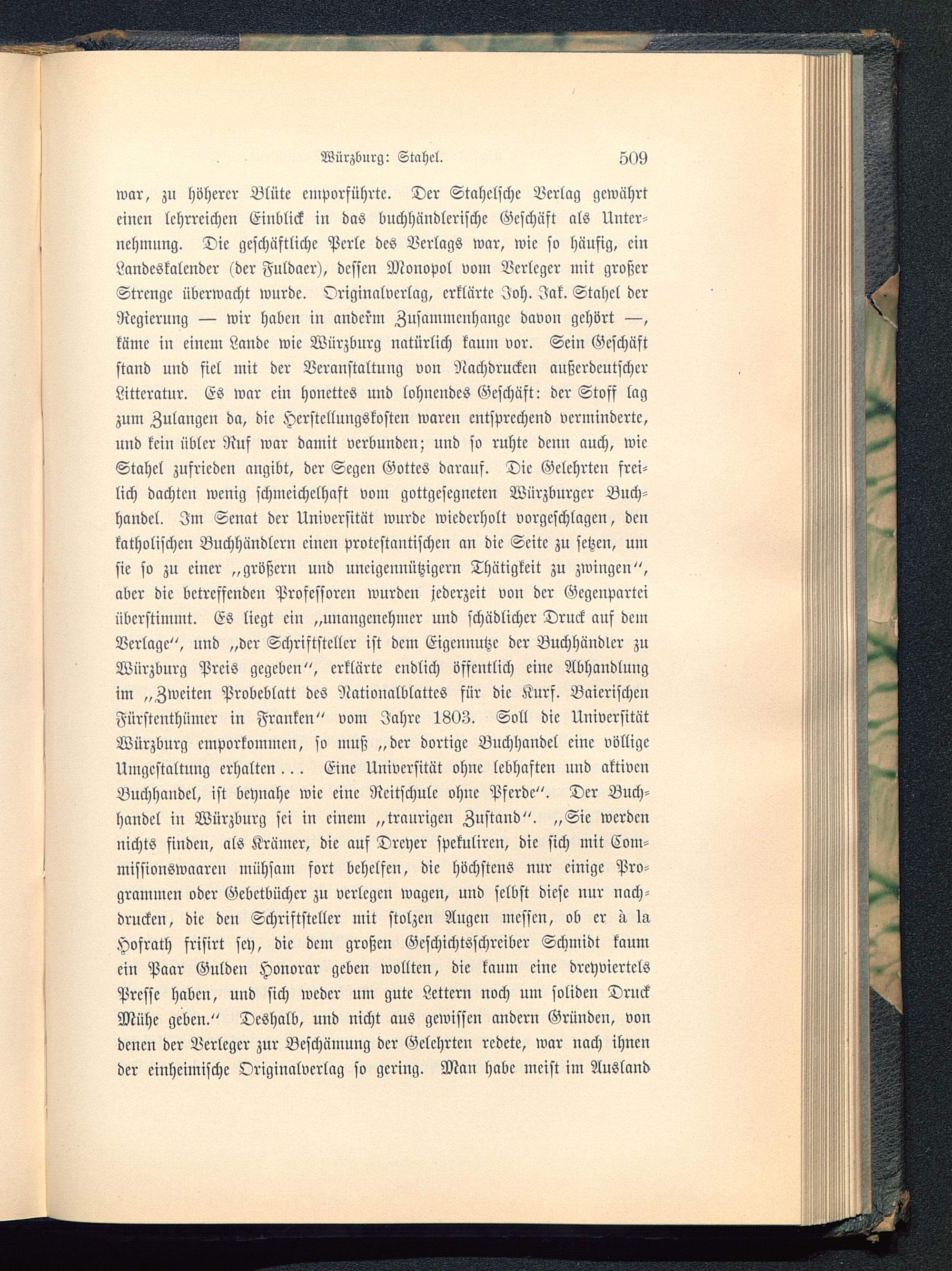 war, zu höherer Blüte emporführtc. Der Stahclsche Verlag gewahrteinen lehrreichen Einblick in das buchhändlerische Geschäft als Unter-nehmung. Die geschäftliche Perle des Verlags war, wie so häufig, einLandeskalendcr (der Fuldaer), dessen Monopol vom Verleger mit großerStrenge überwacht wurde. Originalvcrlag, erklärte Joh. Jak. Stahcl derRegierung — wir haben in andcrm Zusammenhange davon gehört —,käme in einem Lande wie Würzburg natürlich kaum vor. Sein Geschäftstand und fiel mit der Veranstaltung von Nachdrucken außcrdeutscherLitteratur. Es war ein honettes und lohnendes Geschäft: der Stoff lagzum Zulangen da, die Herstellungskosten waren entsprechend verminderte,und kein übler Ruf war damit verbunden; und so ruhte denn auch, wieStahel zufrieden angibt, der Segen Gottes darauf. Die Gelehrten frei-lich dachten wenig schmeichelhaft vom gottgesegneten Würzburger Buch-handel. Im Senat der Universität wurde wiederholt vorgeschlagen, denkatholischen Buchhändlern einen protestantischen an die Seite zu setzen, umsie so zu einer „größern und uneigennützigem Thätigkeit zu zwingen",aber die betreffenden Professoren wurden jederzeit von der Gegenparteiüberstimmt. Es liegt ein „unangenehmer und schädlicher Druck auf deinVerlage", und „der Schriftsteller ist dem Eigennütze der Buchhändler zuWiirzburg Preis gegeben", erklärte endlich öffentlich eine Abhandlungim „Zweiten Probeblatt des Nationalblattcs für die Kurf. BaierischenFürstcnthümer in Franken" vom Jahre 1803. Soll die UniversitätWürzburg emporkommen, so muß „der dortige Buchhandel eine völligeUmgestaltung erhalten ... Eine Universität ohne lebhaften und aktivenBuchhandel, ist beynahe wie eine Reitschule ohne Pferde". Der Buch-handel iu Würzburg sei in einem „traurigen Zustand". „Sie werdennichts finden, als Krümer, die auf Dreher spekuliren, die sich mit Com-missionswaarcn mühsam fort bchclfen, die höchstens nur einige Pro-grammen oder Gebetbücher zu verlegen wagen, und selbst diese nur nach-drucken, die den Schriftsteller mit stolzen Augen messen, ob er ä 1s.Hofrath frisirt scy, die dem großen Geschichtsschreiber Schmidt kaumein Paar Guldeu Honorar geben wollten, die kaum eine drcyviertclsPresse haben, und sich weder um gute Lettern noch um soliden DruckMühe geben." Deshalb, und nicht aus gewissen andern Gründen, vondenen der Verleger zur Beschämung der Gelehrten redete, war nach ihnender einheimische Originalverlag so gering. Man habe meist im Ausland