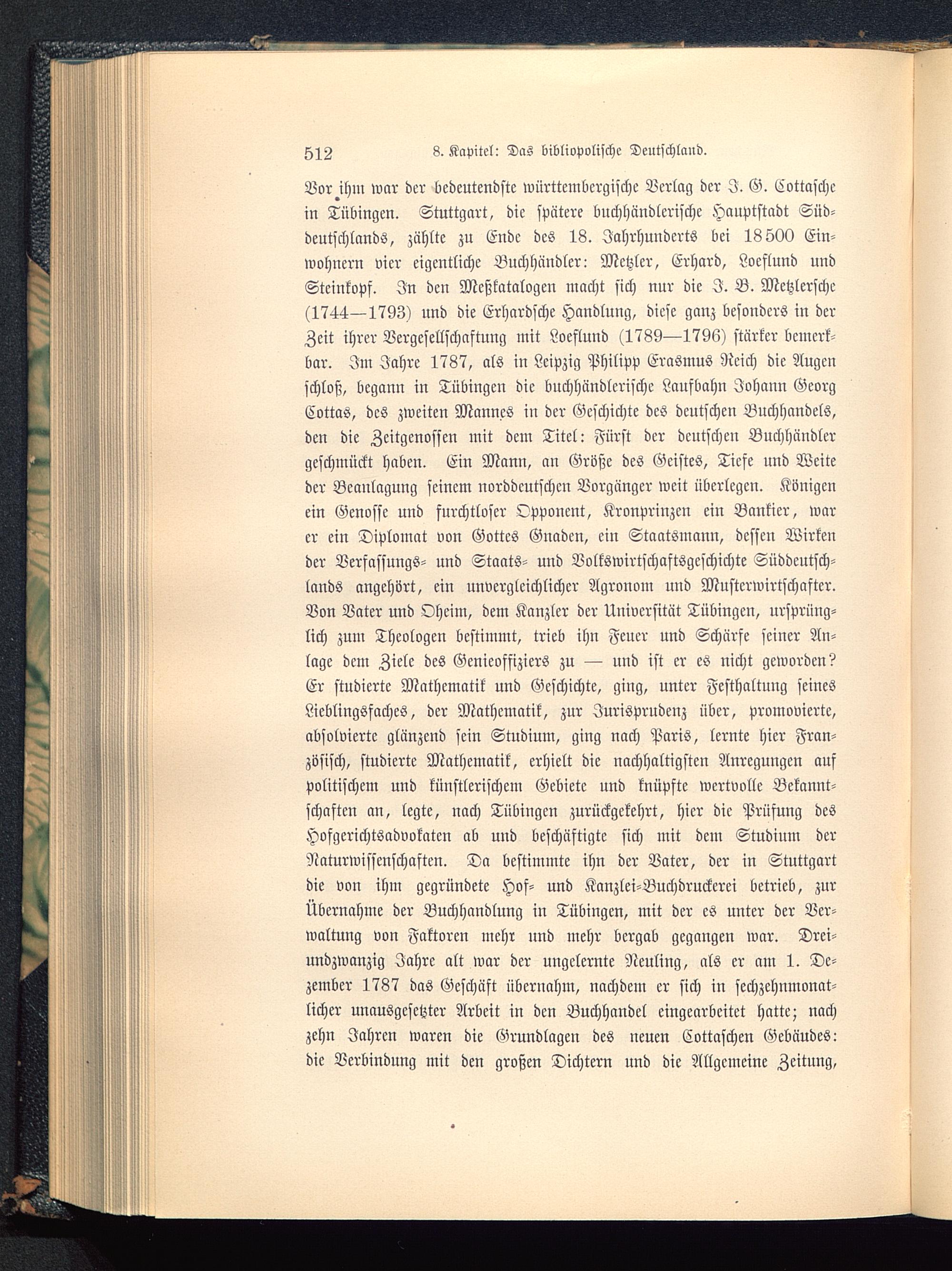 Vor ihm war der bedeutendste württembcrgische Verlag der I. G. Cottaschcin Tübingen. Stuttgart, die spätere buchhändlerische Hauptstadt Süd-deutschlands , zählte zu Ende des 18. Jahrhunderts bei 18500 Ein-wohnern vier eigentliche Buchhändler: Metzler, Erhard, Loeflund undSteinkopf. In den Meßkatalogen macht sich nur die I. B. Metzlersche(1744—1793) und die Erhardsche Handlung, diese ganz besonders in derZeit ihrer Vergesellschaftung mit Loeflund (1789—1796) stärker bemerk-bar. Im Jahre 1787, als in Leipzig Philipp Erasmus Reich die Augenschloß, begann in Tübingen die buchhändlerischc Laufbahn Johann GeorgCottas, des zweiten Mannes in der Geschichte des deutschen Buchhandels,den die Zeitgenossen mit dem Titel: Fürst der deutschen Buchhändlergeschmückt haben. Ein Mann, an Größe des Geistes, Tiefe und Weiteder Beanlagung seinem norddeutschen Vorgänger weit überlegen. Königenein Genosse und furchtloser Opponent, Kronprinzen ein Bankier, warer ein Diplomat von Gottes Gnaden, ein Staatsmann, dessen Wirkender Verfassungs- und Staats- und Volkswirtschaftsgcschichte Süddeutsch-lands angehört, ein unvergleichlicher Agronom und Musterwirtschafter.Von Vater und Oheim, dem Kanzler der Universität Tübingen , ursprüng-lich zum Theologen bestimmt, trieb ihn Feuer und Schärfe seiner An-lage dem Ziele des Genieoffiziers zu — und ist er es nicht geworden?Er studierte Mathematik und Geschichte, ging, unter Festhaltung seinesLieblingsfaches, der Mathematik, zur Jurisprudenz über, promovierte,absolvierte glänzend sein Studium, ging nach Paris , lernte hier Fran-zösisch, studierte Mathematik, erhielt die nachhaltigsten Anregungen aufpolitischem und künstlerischem Gebiete und knüpfte wertvolle Bekannt-schaften an, legte, nach Tübingen zurückgekehrt, hier die Prüfung desHofgcrichtsadvokaten ab und beschäftigte sich mit dem Studium derNaturwissenschaften. Da bestimmte ihn der Vater, der in Stuttgart die von ihm gegründete Hof- und Kanzlei-Buchdruckcrei betrieb, zurÜbernahme der Buchhandlung in Tübingen , mit der es unter der Ver-waltung von Faktoren mehr und mehr bergab gegangen war. Drei-undzwanzig Jahre alt war der ungelernte Neuling, als er am 1. De-zember 1787 das Geschäft übernahm, nachdem er sich in sechzehnmonat-licher unausgesetzter Arbeit in den Buchhandel eingearbeitet hatte; nachzehn Jahren waren die Grundlagen des neuen Cottaschen Gebäudes:die Verbindung mit den großen Dichtern und die Allgemeine Zeitung ,