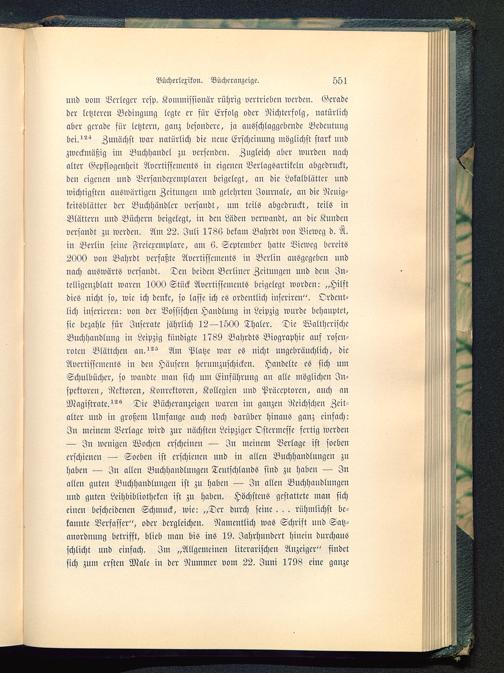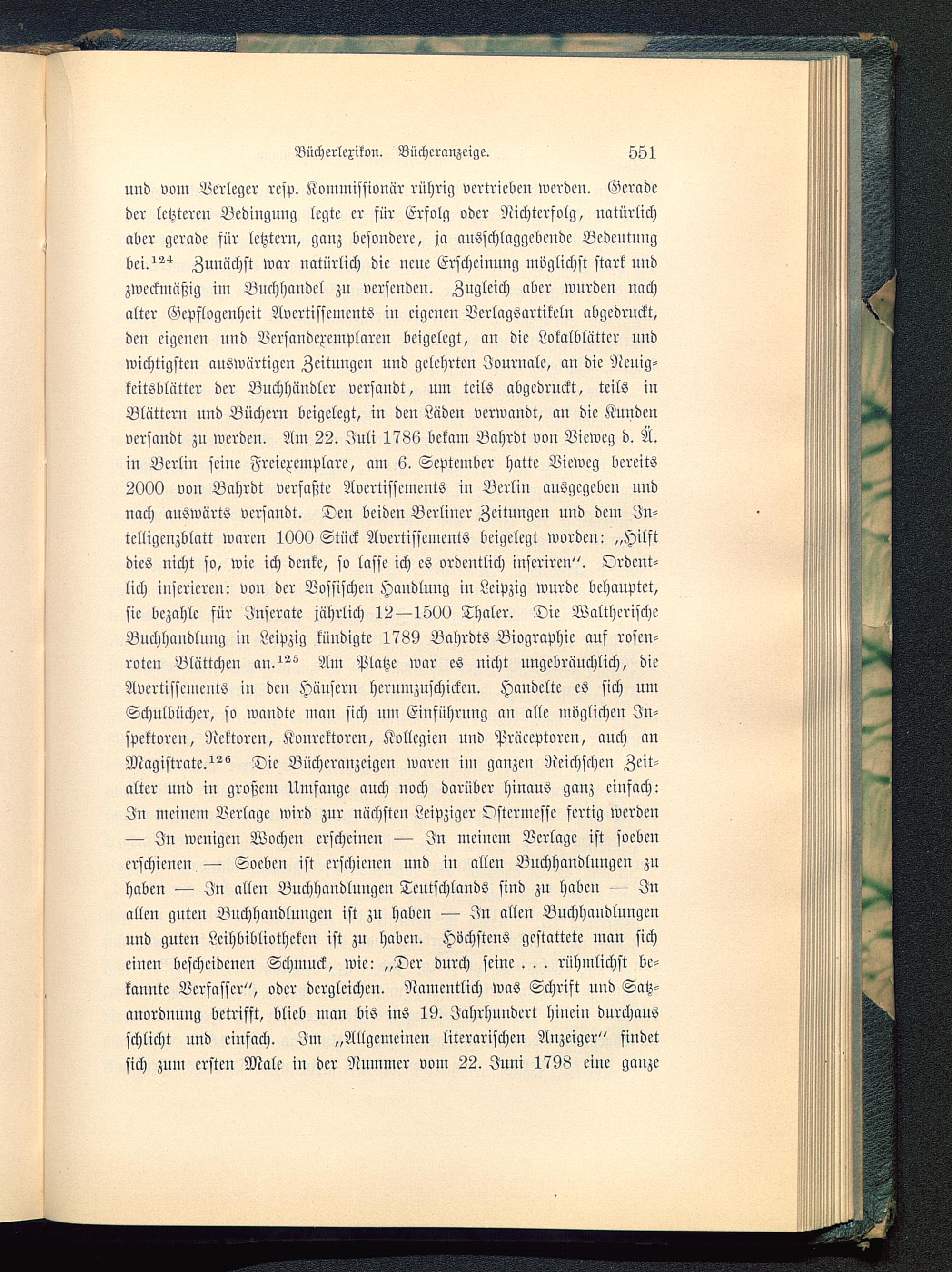 und vom Verleger resp. Kommissionär rührig vertrieben werden. Geradeder letzteren Bedingung legte er für Erfolg oder Nichterfolg, natürlichaber gerade für letztern, ganz besondere, ja ausschlaggebende Bedeutungbei.^ Zunächst war natürlich die neue Erscheinung möglichst stark undzweckmäßig im Buchhandel zu versenden. Zugleich aber wurden nachalter Gepflogenheit Avcrtissements in eigenen Verlagsartikeln abgedruckt,den eigenen und Versandexemplaren beigelegt, an die Lokalblätter undwichtigsten auswärtigen Zeitungen und gelehrten Journale, an die Ncuig-keitsblütter der Buchhändler versandt, um teils abgedruckt, teils inBlättern und Büchern beigelegt, in den Läden verwandt, an die Kundenversandt zu werden. Am 22. Juli 1786 bekam Bahrdt von Vieweg d. Ä.in Berlin seine Freiexemplare, am 6. September hatte Vieweg bereits2000 von Bahrdt verfaßte Avertisscments in Berlin ausgegeben undnach auswärts versandt. Den beiden Berliner Zeitungen und dem Jn-telligcnzblatt waren 1000 Stück Avcrtisseiueuts beigelegt worden- „Hilftdies nicht so, wie ich denke, so lasse ich es ordentlich iuscrircn". Ordent-lich inserieren: von der Vossischen Handlung in Leipzig wurde behauptet,sie bezahle für Inserate jährlich 12—1500 Thaler. Die WalthcrischeBuchhandlung in Leipzig kündigte 1789 Bahrdts Biographie auf rosen-roten Blättchen an. Am Platze war es nicht ungebräuchlich, dieAvertisscments in den Häusern herumzuschickcn. Handelte es sich umSchulbücher, so wandte man sich um Einführung an alle möglichen In-spektoren, Rektoren, Konrektoren, Kollegien und Präccptorcn, auch anMagistrate.^ Die Bücheranzcigcn waren im ganzen Reichschen Zeit-alter und in großem Umfange auch noch darüber hinaus ganz einfach:In meinem Verlage wird zur nächsten Leipziger Ostcrmessc fertig werden— In wenigen Wochen erscheinen — In meinem Verlage ist soebenerschienen — Soeben ist erschienen und in allen Buchhandlungen zuhaben — In allen Buchhandlungen Teutschlands sind zu haben — Inallen guten Buchhandlungen ist zu haben — In allen Buchhandlungenund guten Leihbibliotheken ist zu haben. Höchstens gestattete man sicheinen bescheidenen Schmuck, wie: „Der durch seine. . . rühmlichst be-kannte Verfasser", oder dergleichen. Namentlich was Schrift und Satz-anordnuug betrifft, blieb man bis ins 19. Jahrhundert hinein durchausschlicht und einfach. Im „Allgemeinen literarischen Anzeiger" findetsich zum ersten Male in der Nummer vom 22. Juni 1798 eine ganze