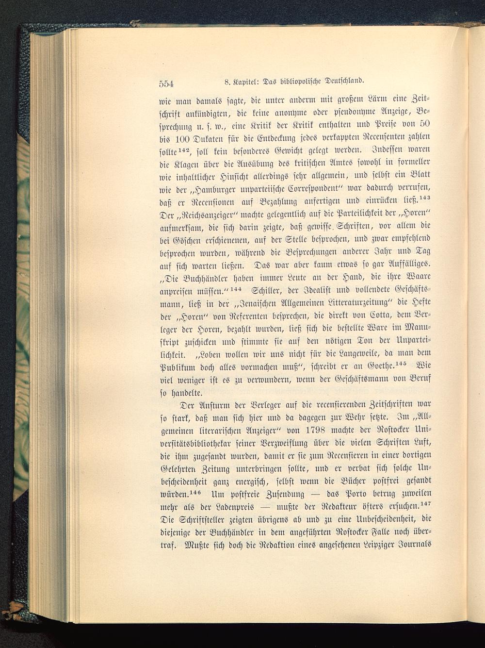 wie man damals sagte, die unter cmderm mit großem Lärm eine Zeit-schrift ankündigten, die keine anonyme oder Pseudonyme Anzeige, Be-sprechung u. s. w., eine Kritik der Kritik enthalten uud Preise von 50bis 100 Dukaten für die Entdeckung jedes verkappten Ncccnsenteu zahlensollte"', soll kein besonderes Gewicht gelegt werden. Indessen warendie Klagen über die Ausübung des kritischen Amtes sowohl in formellerwie inhaltlicher Hinsicht allerdings sehr allgemein, nnd selbst ein Blattwie der „Hamburger unparteiische Correspondent" war dadurch verrufen,daß er Ncccnsioncn auf Bezahlung anfertigen und einrücken ließ."^Der „Rcichsanzcigcr" machte gelegentlich auf die Parteilichkeit der „Hören"aufmerksam, die sich darin zeigte, daß gewisse Schriften, vor allem diebei Göschen erschienenen, auf der Stelle besprochen, und zwar empfehlendbesprochen wurden, während die Besprechungen anderer Jahr und Tagauf sich warten ließen. Das war aber kaum etwas so gar Auffälliges.„Die Buchhändler haben immer Leute an der Hand, die ihre Waareanpreisen müssen." Schiller, der Idealist und vollendete Geschäfts-mann, ließ in der „Jenaischcn Allgemeinen Litteraturzeitung" die Hefteder „Hören" von Referenten besprechen, die direkt von Cotta, dem Ver-leger der Hören, bezahlt wurden, ließ sich die bestellte Ware im Manu-skript zuschicken uud stimmte sie auf den nötigen Ton der Unpartei-lichkeit. „Loben wollen wir uns nicht für die Langeweile, da mau demPublikum doch alles vormachen muß", schreibt er an Goethe. ^viel weniger ist es zu verwundern, wenn der Geschäftsmann von Berusso handelte.