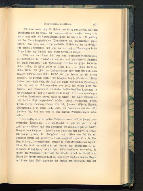 Was man vor Augen sah, war eine zunehmende Beschlcnnignngdes Wachstums der Produktion uud eiue noch auffallendere Zunahmeder Buchhandlungen. Die Meßkataloge erreichen die Ziffer 1000 imJahre 1695, die Ziffer 2000 im Jahre 1771, die Ziffer 4000 imJahre 1800. Die Zahl der Buchhandlungen aber hatte sich nach einerAngabc' Gädickcs vom Jahre 1803^ seit zehn Jahren um ein Viertelvermehrt, für Preußen wurde 1802 berechnet, daß sie sich seit den 1760erJahren verdreifacht habe, die Zahl der direkt verkehrenden Handlungenhatte sich nach den Ncformgutachtcu von 1802 seit Reichs Tode ver-doppelt. Wir erinnern uns des starken buchhalterischen Zudrcmges inden Hauptplätzcn. Auf der andern Seite wuchsen Sortimentshandlungenin kleinen Landstädten empor, sogar in solchen, die weder Gymnasiumnoch starkes Regieruugspcrsoual besaßen. Fürth, Ronneburg, Pcnig,Pirna, Borna, Eamburg, Eahla, Elberfeld, Hadamar , Cüstriu, Ruppiu,Schncpfenthal z. B. waren solche Orte, von denen man mit einer ArtEntsetzen sah, daß nun auch sie ihre eigenen Buchhandluugcn habensollten.