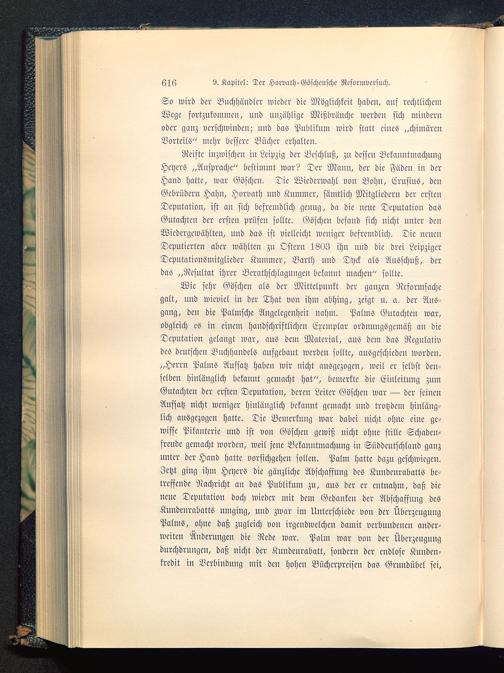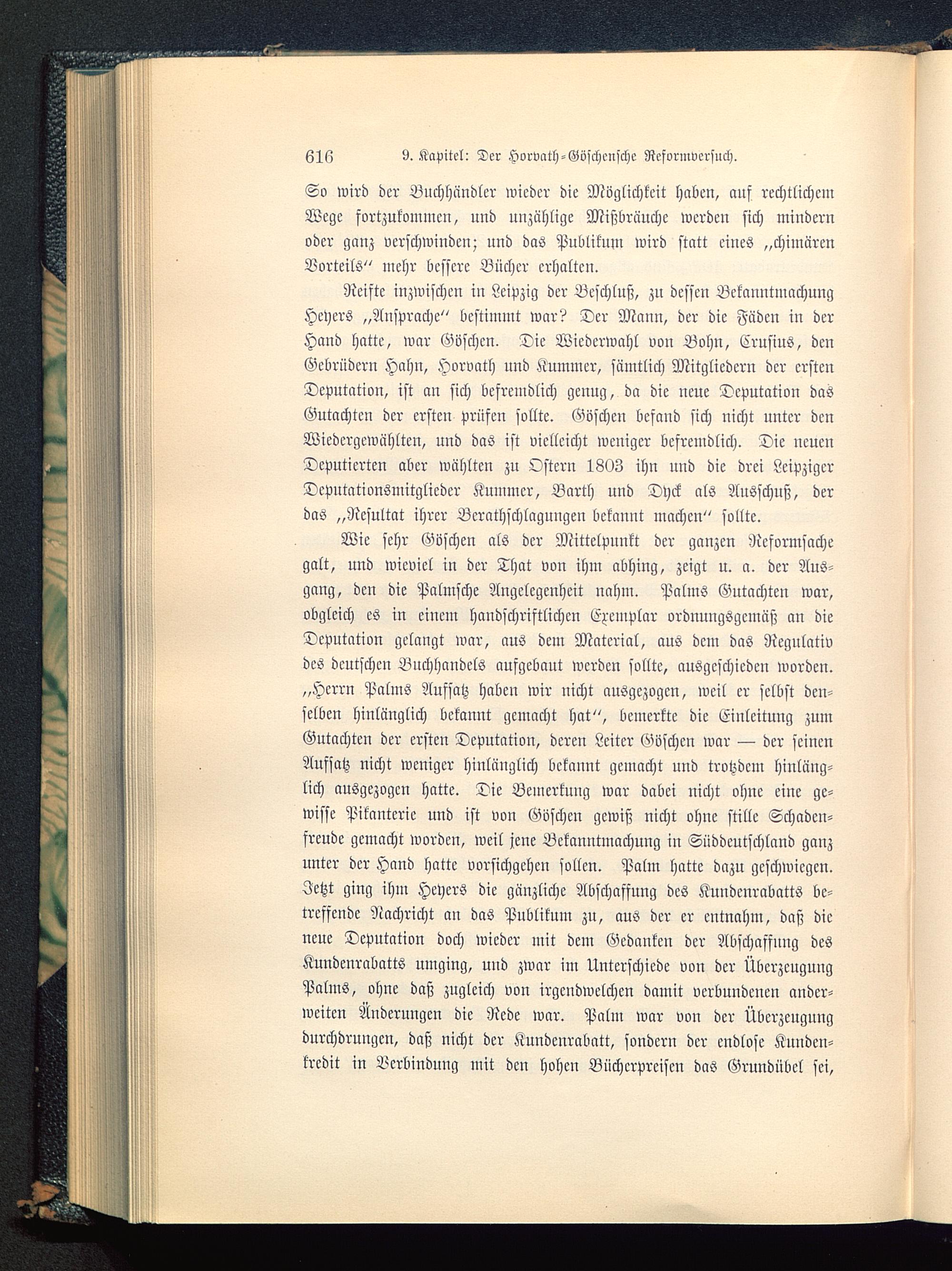 Wie sehr Göschen als der Mittelpunkt der ganzen Rcformsachegalt, und wieviel in der That von ihm abhing, zeigt u. a. der Aus-gang, den die Palmsche Angelegenheit nahm. Palms Gutachten war,obgleich es in einem handschriftlichen Exemplar ordnungsgemäß an dieDeputation gelangt war, aus dem Material, aus dem das Regulativdes deutschen Buchhandels aufgebaut werden sollte, ausgeschieden worden.„Herrn Palms Aufsatz haben wir nicht ausgezogen, weil er selbst den-selben hinlänglich bekannt gemacht hat", bemerkte die Einleitung zumGutachten der ersten Deputation, deren Leiter Göschen war — der seinenAufsatz nicht weniger hinlänglich bekannt gemacht und trotzdem hinläng-lich ausgezogen hatte. Die Bemerkung war dabei uicht ohne eine ge-wisse Pikantcrie und ist von Göschen gewiß nicht ohne stille Schaden-freude gemacht worden, weil jene Bekanntmachung in Süddcutschlano ganznnter der Hand hatte vorsichgchcn sollen. Palm hatte dazu geschwiegen.Jetzt ging ihm Heyers die gänzliche Abschaffung des Kundcnrabatts be-treffende Nachricht an das Publikum zu, aus der er entnahm, daß dieneue Deputation doch wieder mit dem Gedanken der Abschaffung desKundcnrabatts umging, und zwar im Unterschiede von der ÜberzeugungPalms, ohne daß zugleich von irgendwelchen damit verbundenen ander-weiten Änderungen die Rede war. Palm war von der Überzeugungdurchdrungen, daß nicht der Kundenrabatt, sondern der endlose Kuuden-tredit in Verbindung mit den hohen Büchcrprciscn das Grundnbcl sei,