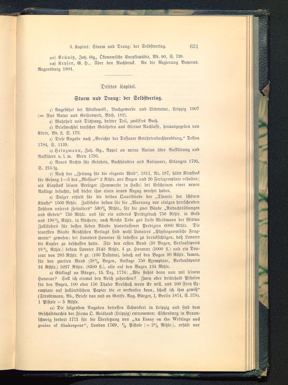 s) Sulzer erhielt für die beiden Qnartbünde der „Theorie der schönenKünste" 1500 Rthlr. Zollikofer bekam für die „Warnnug vor einigen herrschendenFehlern unseres Zeitalters" 530"/g Rthlr., für die zwei Bände „Andachtsübnngenuud Gebete" 750 Rthlr. und für ein anderes Predigtbuch 750 Rthlr. iu Geldund 198 Rthlr. in Büchern; nach Reichs Tode gab Luise Weidmann der WittwcZollikofers für dessen sieben Bände hinterlasscuer Predigten 6000 Rthlr. Dieteuersten Bände Reichschcn Verlags sind wohl Lavatcrs „Physiognomischc Frag-mente" gewesen; bei Lavatcrs Honorar ist indessen zu berücksichtigen, daß Lnvaterdie Kupfer zu beschaffcu hatte. Für den ersten Band (38 Bogen, Verkaufspreis182/g Rthlr.) bekam Lavater 3148 Rthlr. 4 gr. Honorar (5000 fl.) und ein Dou-ceur von 283 Rthlr. 8 gr. (100 Dukaten), sodaß auf deu Bogen 90 Rthlr. kamen,für den zweiten Band (38^ Bogen, Auflage 750 Exemplare, Verkaufspreis24 Rthlr.) 5227 Rthlr. (8300 fl.), also auf deu Bogen 134 Rthlr.,