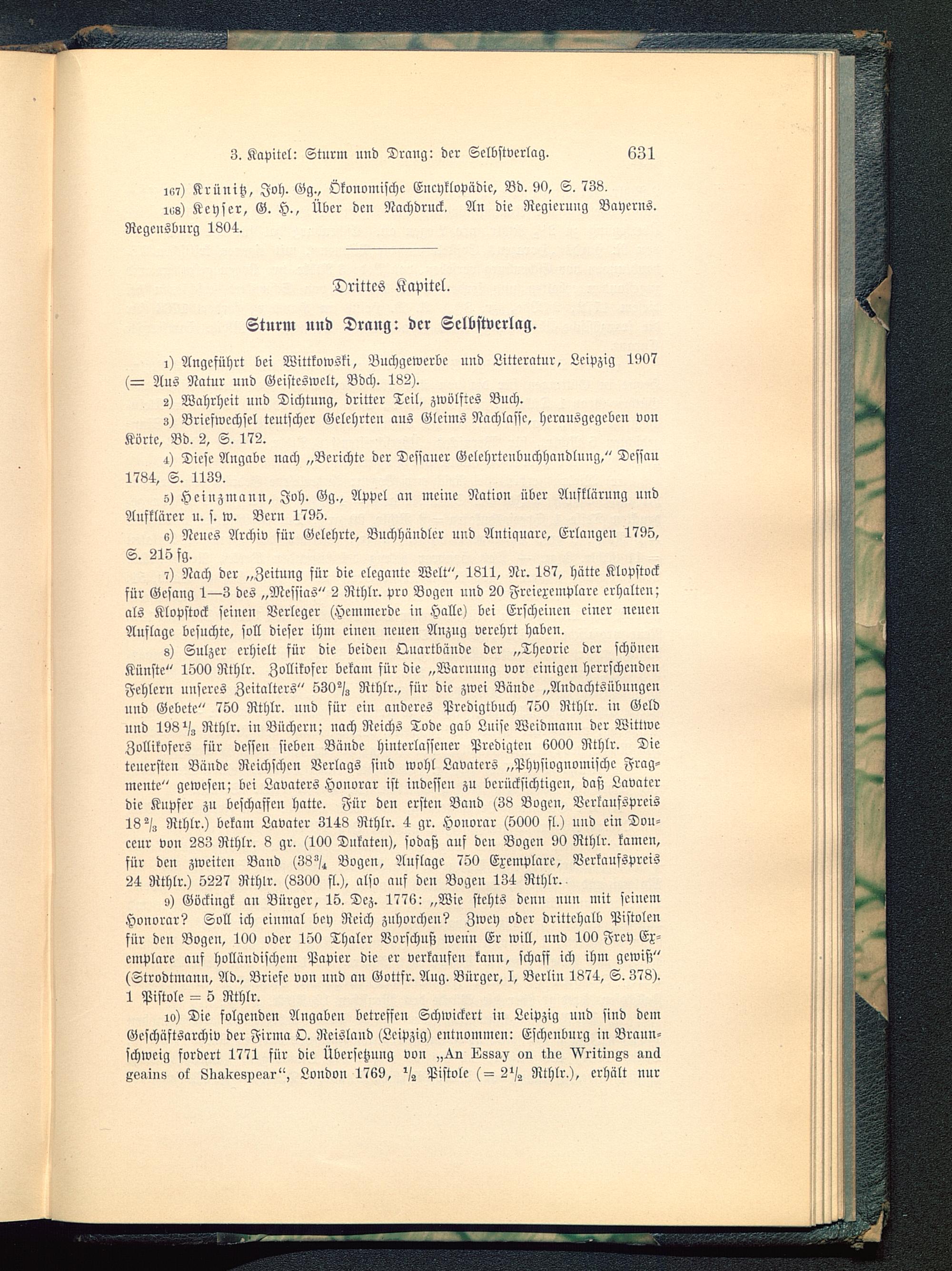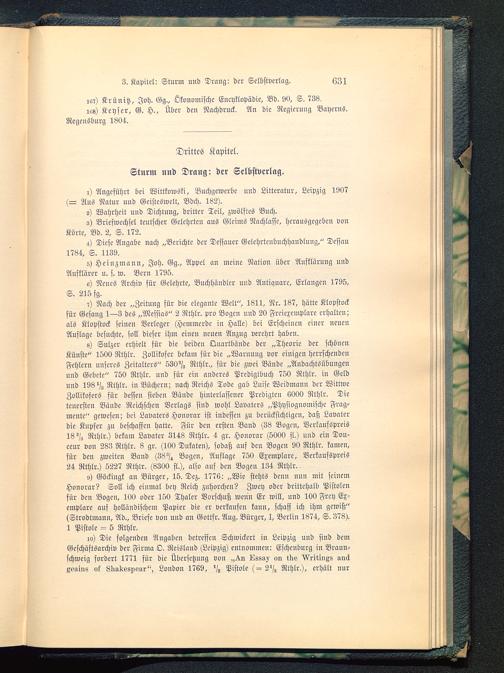 0) Göckingk an Bürger, 15. Dez. 1776: „Wie stchts denn nun mit seinemHonorar? Soll ich einmal bep Reich zuhorchen? Zwey oder drittehalb Pistolenfür den Bogen, 100 oder 150 Thaler Borschuß wenn Er will, und 100 Frey Ex-emplare auf holländischem Papier die er verkaufen kanu, schaff ich ihm gewiß"(Strodtmcmn, Ad., Briefe von nnd an Gottfr. Ang. Bürger, I, Berlin 1874, S. 378).1 Pistole 5 Rthlr.