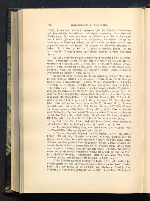15) Lavater , Geheimes Tagebuch 3 Rthlr.; Chladni, Theorie des Klangs4 Rthlr.; Schröckh, Allg. Weltgesch. für Kinder, Ramdohr, Schriften über dieMalerei und Rciuhold, Herzcuserleichterungen 5 Rthlr.; Göckingk , Lieder zweierLiebenden und Sinngedichte 2 Dnkatcn; Johannes Müller, Schweizcrgcschichte undLavater, Poesien 6 Rthlr.; Lavater sollte für die Geschichte Jesu, auf die Reichdann verzichtete, 1 Carolin erhalten; Johannes Müller, Geschichte des Fürstcn-bundes und Briefe zweener Domherrn 9 Rthlr.; der 1. Thl. von Helferich PeterSturz' Schriften 10 Rthlr.; Zimmermann, Über die Einsamkeit 12^ Rthlr.;Zollikofer, Predigt über die Würde des Menschen 12 Rthlr. 17 gr.
