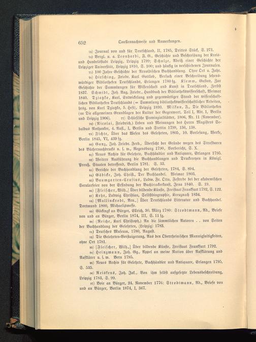 75) 100 Jahre Geschichte der Aruoldischen Buchhandlung. Ohne Ort n. Jahr.Hirsching, Friedr. Karl Gottlob , Versuch einer Beschreibung sehens-würdiger Bibliotheken Teutschlands, Erlangen 1780 fg. Klemm, Gnstav, ZurGeschichte der Saminlnugen für Wissenschaft nnd Kunst in Tcntschlaud, Zerbst 1837. Schmidt, Joh. Aug. Friedr., Handbuch der Bibliothekswissenschaft, Weimar 1840. Dziatzko, Karl, EntWickelung uud gegenwärtiger Stand der wissenschaft-lichen Bibliotheken Deutschlands ( — Sammlung bibliothckswissenschaftlicher Arbeiten,hrsg. von Karl Dziatzko, 5. Heft), Leipzig 1893. Milkau, F., Die Bibliotheken(— Die allgemeinen Grundlagen der Kultur der Gegenwart, Teil I, Abt. 1, Berlin und Leipzig 1906). ??) Schlesischc Provinzialblättcr, 1806, Nr. 11 (November).