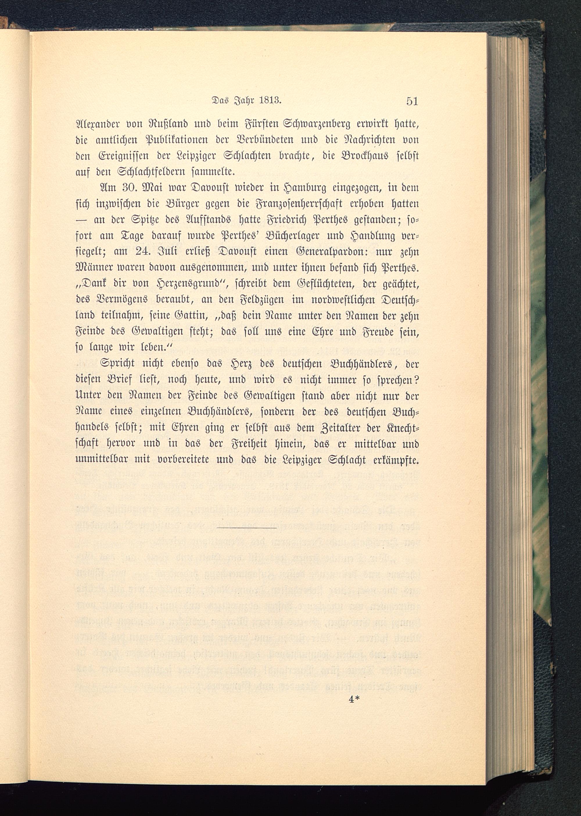 Spricht nicht ebenso das Herz des deutschen Buchhändlers, derdiesen Brief liest, noch heute, und wird es nicht immer so sprechen?Unter den Namen der Feinde des Gewaltigen stand aber nicht nur derName eines einzelnen Buchhändlers, sondern der des deutschen Buch-handels selbst; mit Ehren ging er selbst aus dem Zeitalter der Knecht-schaft hervor und in das der Freiheit hinein, das er mittelbar undunmittelbar mit vorbereitete und das die Leipziger Schlacht erkämpfte.