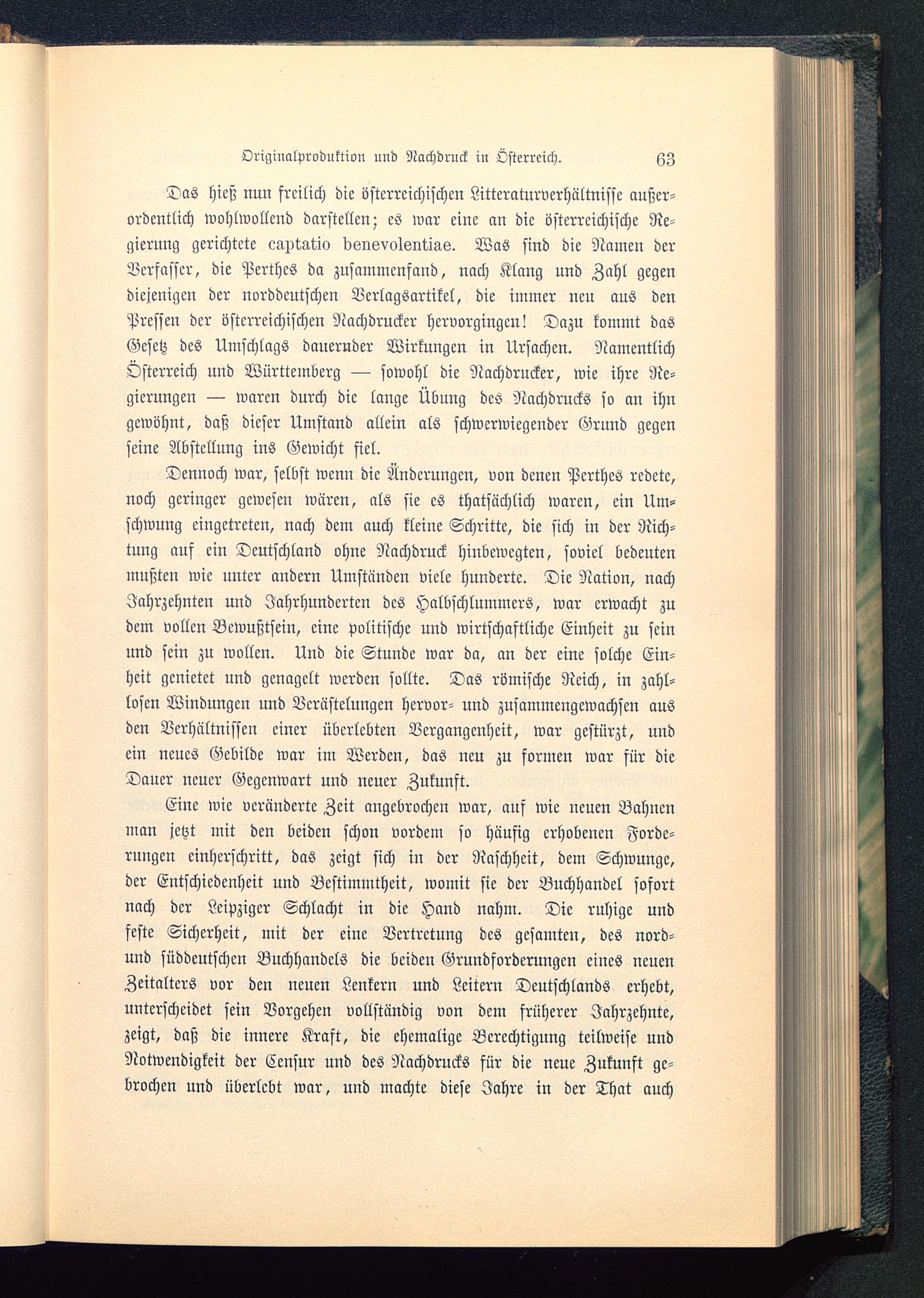 Dennoch war, selbst wenn die Änderungen, von denen Perthes redete,noch geringer gewesen wären, als sie es thatsächlich waren, ein Um-schwung eingetreten, nach dem auch kleine Schritte, die sich in der Rich-tung aus ein Deutschland ohne Nachdruck hinbewegten, soviel bedeutenmußten wie unter andern Umständen viele Hundertc. Die Nation, nachJahrzehnten und Jahrhunderten des Halbschlummers, war erwacht zudem vollen Bewußtsein, eine politische und wirtschaftliche Einheit zu seinund sein zu wollen. Und die Stunde war da, an der eine solche Ein-heit genietet und genagelt werden sollte. Das römische Reich, in zahl-losen Windungen und Verästelungen hervor- und zusammengewachsen ausden Verhältnissen einer überlebten Vergangenheit, war gestürzt, undein neues Gebilde war im Werden, das neu zu formen war für dieDauer neuer Gegenwart und neuer Zukunft.