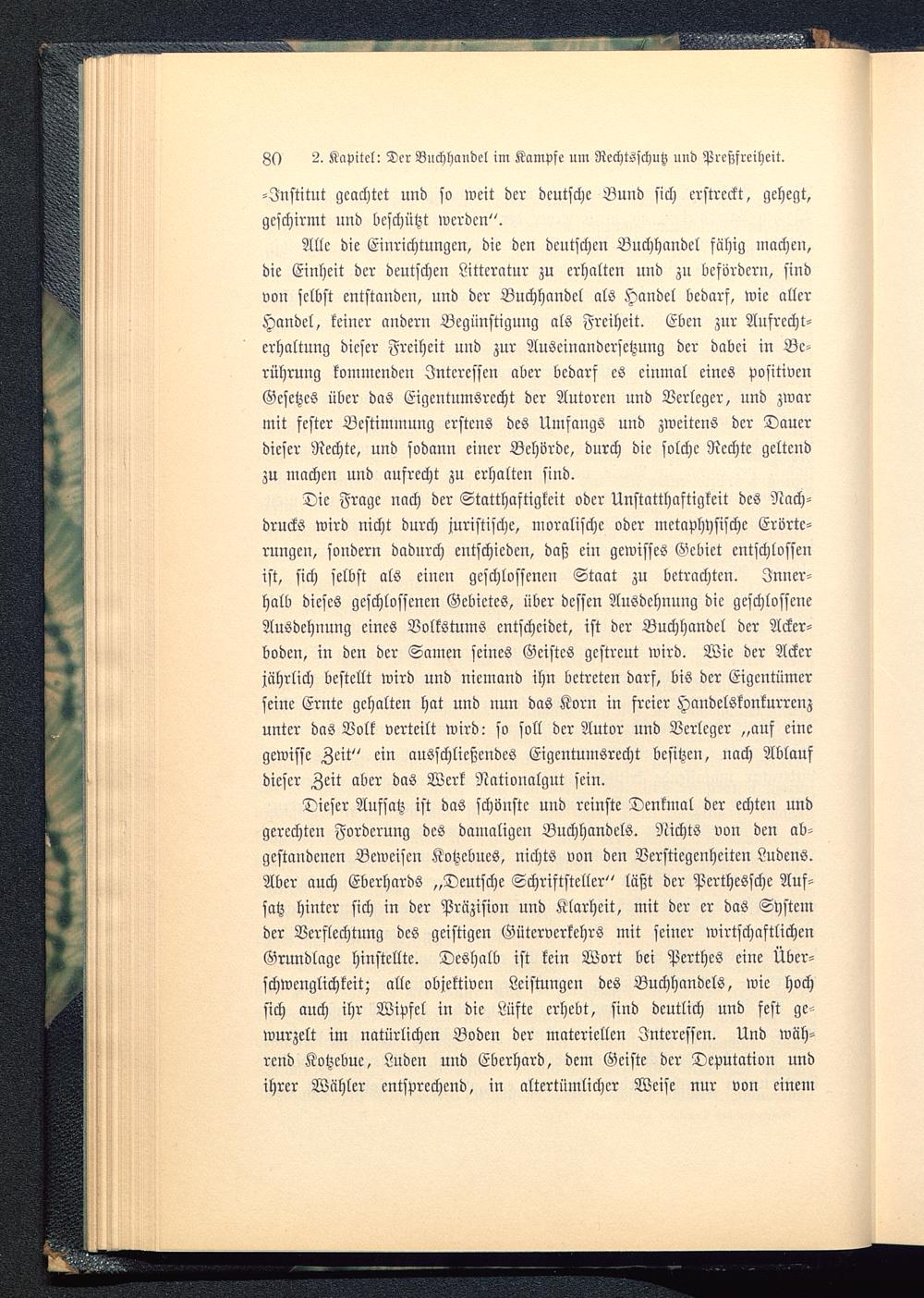 Dieser Aufsatz ist das schönste und reinste Denkmal der echten undgerechten Forderung des damaligen Buchhandels. Nichts von den ab-gestandenen Beweisen Kotzcbues, nichts von den Verstiegenhcitcn Ludens.Aber auch Eberhards „Deutsche Schriftsteller" läßt der Perthessche Auf-satz hinter sich in der Präzision und Klarheit, mit der er das Systemder Verflechtung des geistigen Güterverkehrs mit seiner wirtschaftlichenGrundlage hinstellte. Deshalb ist kein Wort bei Perthes eine Über-schwenglichkeit; alle objektiven Leistungen des Buchhandels, wie hochsich auch ihr Wipfel in die Lüfte erhebt, sind deutlich und fest ge-wurzelt im natürlichen Boden der materiellen Interessen. Und wäh-rend Kotzcbuc, Luden und Eberhard, dem Geiste der Deputation undihrer Wähler entsprechend, in altertümlicher Weise nur von einem