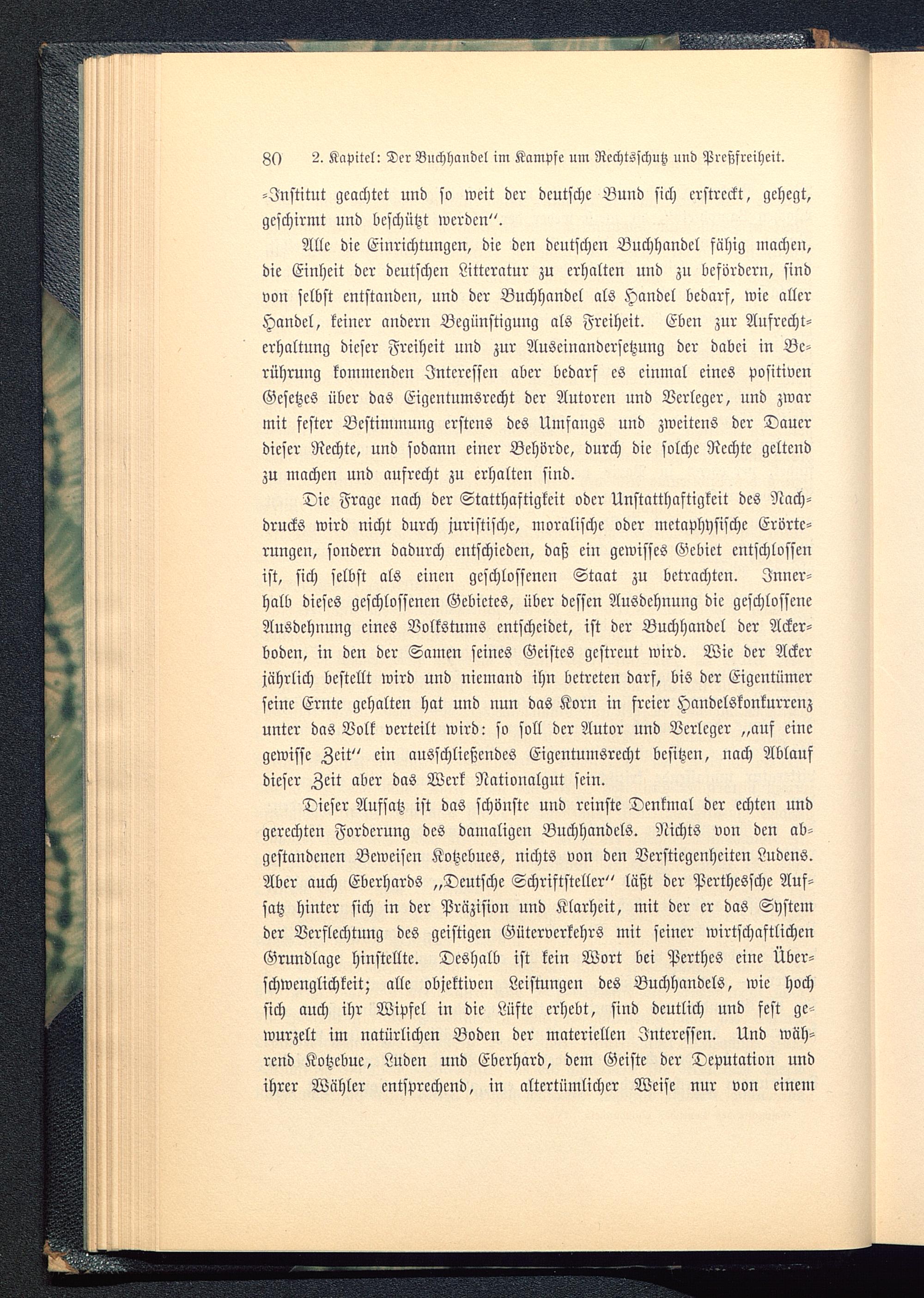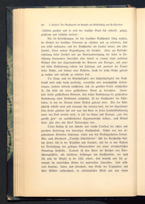 Die Frage nach der Statthaftigkeit oder Unstatthaftigkeit des Nach-drucks wird nicht durch juristische, moralische oder metaphysische Erörte-rungen, sondern dadurch entschieden, daß ein gewisses Gebiet entschlossenist, sich selbst als einen geschlossenen Staat zu betrachten. Inner-halb dieses geschlossenen Gebietes, über dessen Ausdehnung die geschlosseneAusdehnung eines Volkstums cutscheidet, ist der Buchhandel der Acker-boden, in den der Samen seines Geistes gestreut wird. Wie der Ackerjährlich bestellt wird und niemand ihn betreten darf, bis der Eigentümerseine Ernte gehalten hat und nun das Korn in freier Handelskonkurrenzunter das Volk verteilt wird: so soll der Autor und Verleger „auf einegewisse Zeit" ein ausschließendes Eigentumsrecht besitzen, nach Ablaufdieser Zeit aber das Werk Nationalgut sein.