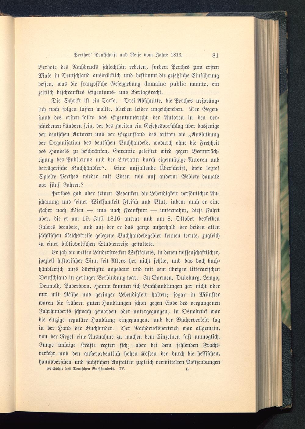 Perthes gab aber seinen Gedanken die Lebendigkeit persönlicher An-schauung und seiner Wirksamkeit Fleisch und Blut, indem auch er eineFahrt nach Wien — und nach Frankfurt — unternahm, diese Fahrtaber, die er am 19. Juli 1816 antrat und am 8. Oktober desselbenJahres beendete, und auf der er das ganze außerhalb der beiden altensächsischen Rcichslreise gelegene Buchhandclsgebiet kennen lernte, zugleichzu einer bibliopolischen Studienreise gestaltete.