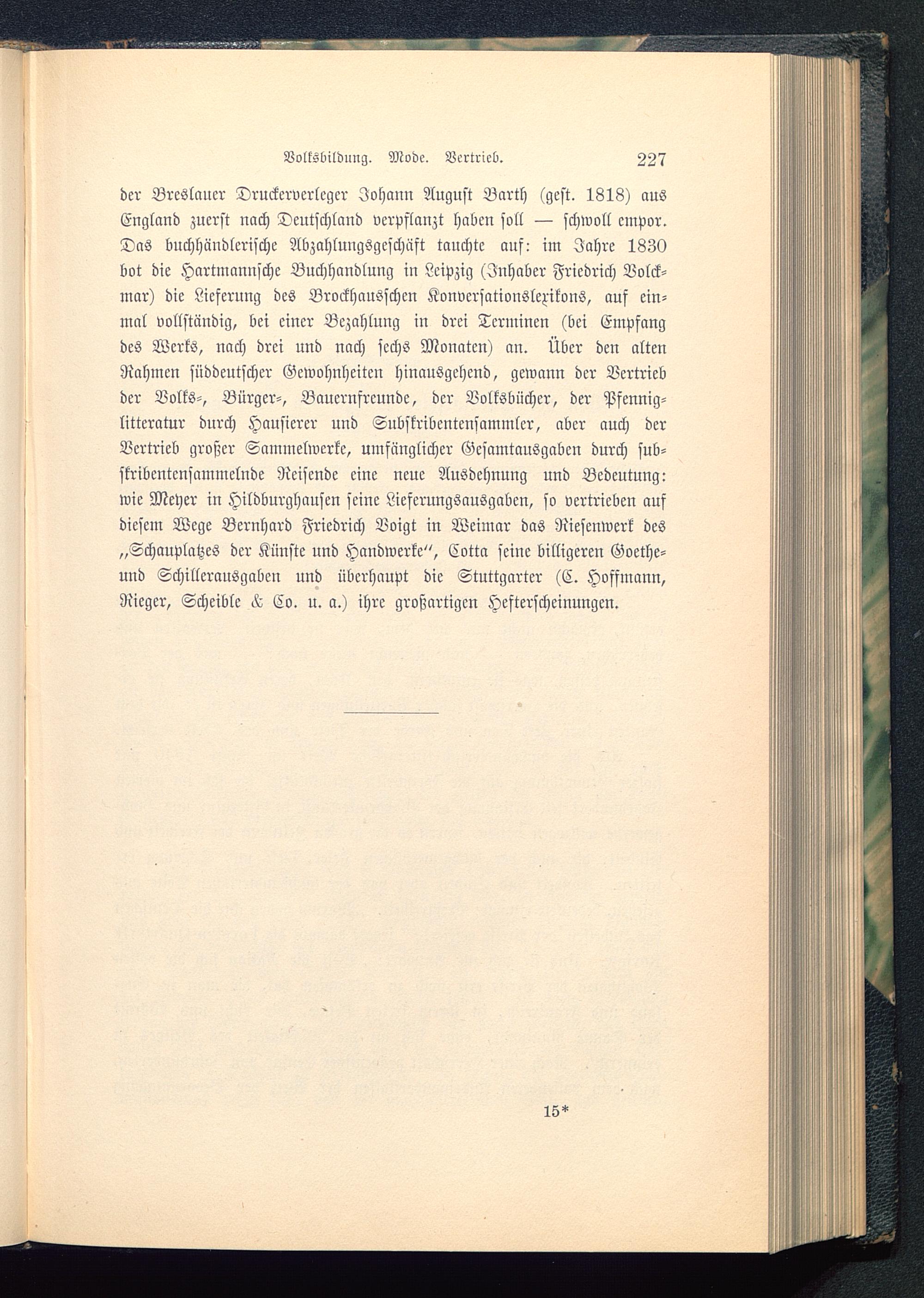 der Breslauer Druckerverlegcr Johann August Barth (gest. 1818) ausEngland zuerst nach Deutschland verpflanzt haben soll — schwoll empor.Das buchhäudlerische Abzahlungsgeschäft tauchte auf: im Jahre 1830bot die Hartmannschc Buchhandlung in Leipzig (Inhaber Friedrich Volck-mar) die Lieferung des Brockhausschcn Konversationslexikons, auf ein-mal vollständig, bei einer Bezahlung in drei Terminen (bei Empfangdes Werls, nach drei und nach sechs Monaten) an. Über den altenRahmen süddeutscher Gewohnheiten hinausgehend, gewann der Bertriebder Volks-, Bürger-, Baucrnfrcundc, der Volksbücher, der Pfennig-littcratur durch Hausierer und Subskribentensammlcr, aber auch derVertrieb großer Sammelwerke, umfänglicher Gesamtausgaben durch sub-skribcntcnsammclnde Reisende eine neue Ausdehnung und Bedeutung:wie Meyer in Hildburghausen seine Lieferungsausgaben, so vertrieben aufdiesem Wege Bernhard Friedrich Voigt in Weimar das Niesenwerk des„Schauplatzes der Künste und Handwerke", Cotta seine billigeren Goethe-und Schillcrausgabcn und überhaupt die Stuttgarter (C. Hoffmann,Rieger, Schcible ^ Co. u. a.) ihre großartigen Hesterschcinungen.