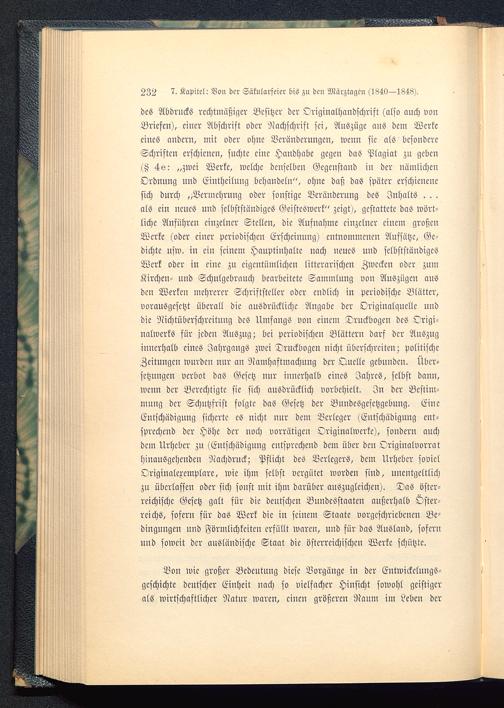 des Abdrucks rechtmäßiger Besitzer der Originalhandschrift (also auch vonBriefen), einer Abschrift oder Nachschrift sei, Auszüge aus dem Werkeeines andern, mit oder ohne Veränderungen, wenn sie als besondereSchriften erschienen, suchte eine Handhabe gegen das Plagiat zu geben(Z 4s: „zwei Werke, welche denselben Gegenstand in der nämlichenOrdnung und Eintheilung behandeln", ohne daß das später erschienenesich durch „Vermehrung oder sonstige Veränderung des Inhalts . . .als ein neues und selbststündiges Geisteswcrk" zeigt), gestattete das wört-liche Anführen einzelner Stellen, die Aufnahme einzelner einem großenWerke (oder einer periodischen Erscheinung) entnommenen Aufsätze, Ge-dichte usw. in ein seinem Hauptinhalte nach neues und selbststündigesWerk oder in eine zu eigentümlichen littcrarischen Zwecken oder zumKirchen- und Schulgcbrnuch bearbeitete Sammlung von Auszügen ausden Werken mehrerer Schriftsteller oder endlich in periodische Blätter,vorausgesetzt überall die ausdrückliche Angabe der Originalquelle unddie Nichtüberschrcitung des UmfaugS von einem Druckbogen des Origi-nalwerks für jeden Auszug; bei periodischen Blättern darf der Auszuginnerhalb eines Jahrgangs zwei Druckbogen nicht überschreiten; politischeZeitungen wurden nur an Namhaftmachung der Quelle gebunden. Über-setzungen verbot das Gesetz nur innerhalb eines Jahres, selbst dann,wenn der Berechtigte sie sich ausdrücklich vorbehielt. In der Bestim-mung der Schutzfrist folgte das Gesetz der Bundesgcsctzgcbung. EineEntschädigung sicherte es nicht nur dem Verleger (Entschädigung ent-sprechend der Höhe der noch vorrätigen Originalwerkc), sondern auchdein Urheber zu (Entschädigung entsprechend dem über deu Originalvorrathinausgehenden Nachdruck; Pflicht des Verlegers, dem Urheber sovielOriginalcremvlare, wie ihm selbst vergütet worden sind, unentgeltlichzu überlassen oder sich sonst mit ihm darüber auszugleichen). Das öster-reichische Gesetz galt für die deutschen Bundesstaaten außerhalb Öster-reichs , sofern für das Werk die in seinem Staate vorgeschriebenen Be-dingungen und Förmlichkeiten erfüllt waren, und für das Ausland, sofernuud soweit der ausländische Staat die österreichischen Werke schützte.