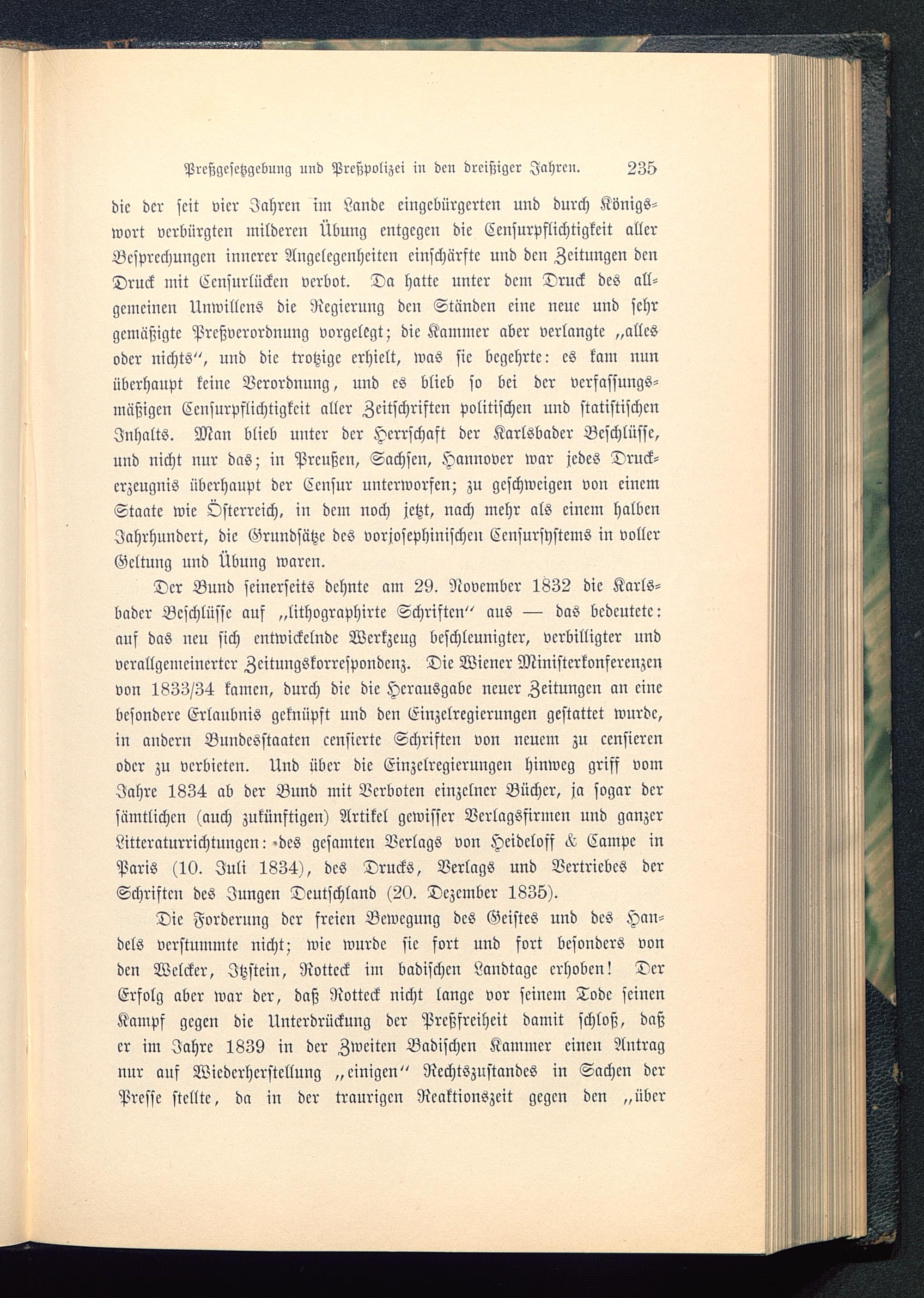 Die Forderung der freien Bewegung des Geistes und des Han-dels verstummte nicht; wie wurde sie fort und fort besonders vonden Welcker, Jtzstein, Rottcck im badischcn Landtage erhoben! DerErfolg aber war der, daß Rottcck nicht lange vor seinem Tode seinenKampf gegen die Unterdrückung der Prcßfreiheit damit schloß, daßer im Jahre 1839 in der Zweiten Badischcn Kammer einen Antragnur auf Wiederherstellung „einigen" Rechtszustandes in Sachen derPresse stellte, da in der traurigen Reaktionszeit gegen den „übcr