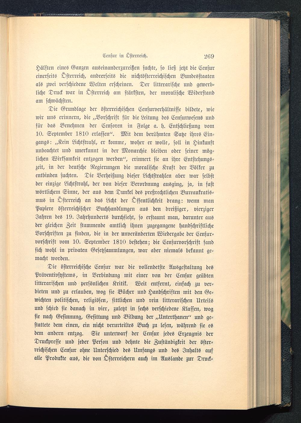 Die Grundlage der österreichischen Censurverhältnisse bildete, wiewir uns erinnern, die „Vorschrift für die Leitung des Censurwesens undfür das Benehmen der Censoren in Folge a. h. Entschließung vom10. September 1810 erlassen". Mit dem berühmten Satze ihres Ein-gangs: „Kein Lichtstrahl, er komme, woher er wolle, soll in Hinkunftunbeachtet und unerkannt in der Monarchie bleiben oder seiner mög-lichen Wirksamkeit entzogen werden", erinnert sie an ihre Entstchungs-zcit, in der deutsche Regierungen die moralische Kraft der Völker zuentbinden suchten. Die Verheißung dieser Lichtstrahlen aber war selbstder einzige Lichtstrahl, der von dieser Verordnung ausging, ja, in fastwörtlichem Sinne, der aus dem Dunkel des preßrechtlichen Bureaukratis-mus in Österreich an das Licht der Öffentlichkeit drang: wenn manPapiere österreichischer Buchhandlungen aus den dreißiger, vierzigerJahren des 19. Jahrhunderts durchsieht, so erstaunt man, darunter ausder gleichen Zeit stammende amtlich ihnen zugegangene handschriftlicheVorschriften zu finden, die in der unveränderten Wiedergabe der Censur-vorschrift vom 10. September 1810 bestehen; die Censurvorschrift fandsich wohl in privaten Gesetzsammlungen, war aber niemals bekannt ge-macht worden.