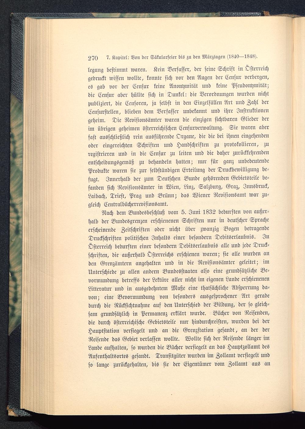 Nach dem Bundesbeschluß vom 5. Juni 1832 bedurften von außer-halb der Bundesgrcnzen erschienenen Schriften nur in deutscher Spracheerscheinende Zeitschriften oder nicht über zwanzig Bogen betragendeDruckschriften politischen Inhalts einer besondern Dcbitserlaubnis. InÖsterreich bedurften einer besondcrn Debitserlaubnis alle und jede Druck-schriften, die außerhalb Österreichs erschienen waren; sie alle wurden anden Grenzämtern angehalten und in die Revisionscimtcr geleitet; imUnterschiede zu allen andern Bundesstaaten also eine grundsätzliche Be-vormundung betreffs der Lektüre aller nicht im eigenen Lande erschienenenLitteratur und in ausgedehntem Maße eine tatsächliche Absperrung da-von; eine Bevormundung von besonders ausgesprochener Art geradedurch die Rücksichtnahme auf den Unterschied der Bildung, der so gleich-sam grundsätzlich in Permanenz erklärt wurde. Bücher von Reisenden,die durch österreichische Gebietsteile nur hindurchreisten, wurden bei derHauptstation versiegelt und an die Grenzstation gesandt, an der derReisende das Gebiet verlassen wollte. Wollte sich der Reisende länger imLande aufhalten, so wurden die Bücher versiegelt an das Hauptzollamt desAufenthaltsortes gesandt. Transitgüter wurden im Zollamt versiegelt undso lange zurückgehalten, bis sie der Eigentümer vom Zollamt aus an