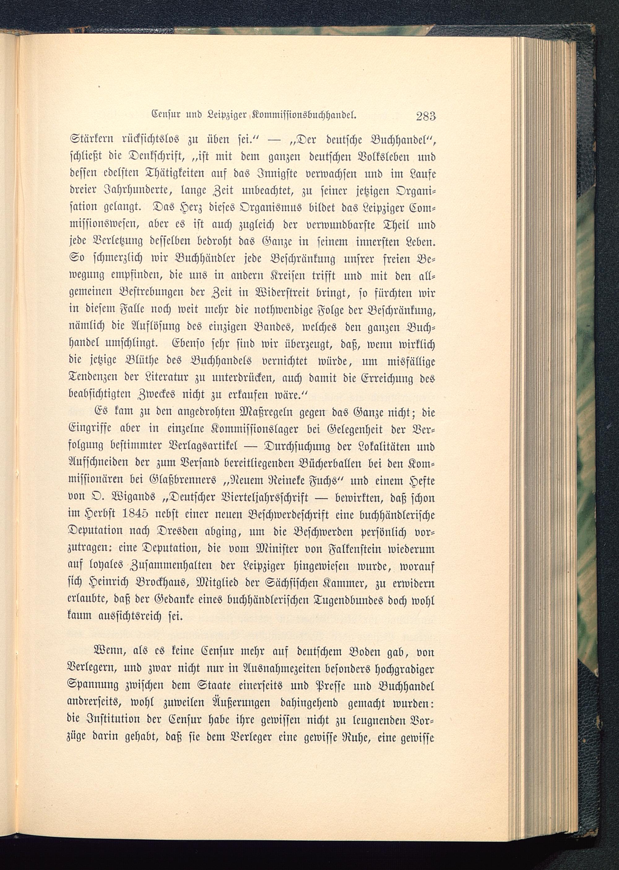 Es kam zu den angedrohten Maßregeln gegen das Ganze nicht; dieEingriffe aber in einzelne Kommissionslagcr bei Gelegenheit der Ver-folgung bestimmter Verlagsartikcl — Durchsuchung der Lokalitäten undAufschneiden der zum Versand bcrcitliegcndcn Bücherballen bei den Kom-missionären bei Glaßbrenncrs „Neuem Reineke Fuchs" und einem Heftevon O. Wigands „Deutscher Vicrteljahrsschrift — bewirkten, daß schonim Herbst 1845 nebst einer neuen Beschwerdeschrist eine buchhändlerischeDeputation nach Dresden abging, um die Beschwerden persönlich vor-zutragen: eine Deputation, die vom Minister von Falkenstcin wiederumauf loyales Zusammenhalten der Leipziger hingewiesen wurde, woraufsich Heinrich Brockhaus , Mitglied der Sächsischen Kammer, zu erwidernerlaubte, daß der Gedanke eines buchhändlerischen Tugendbundes doch wohlkaum aussichtsreich sei.