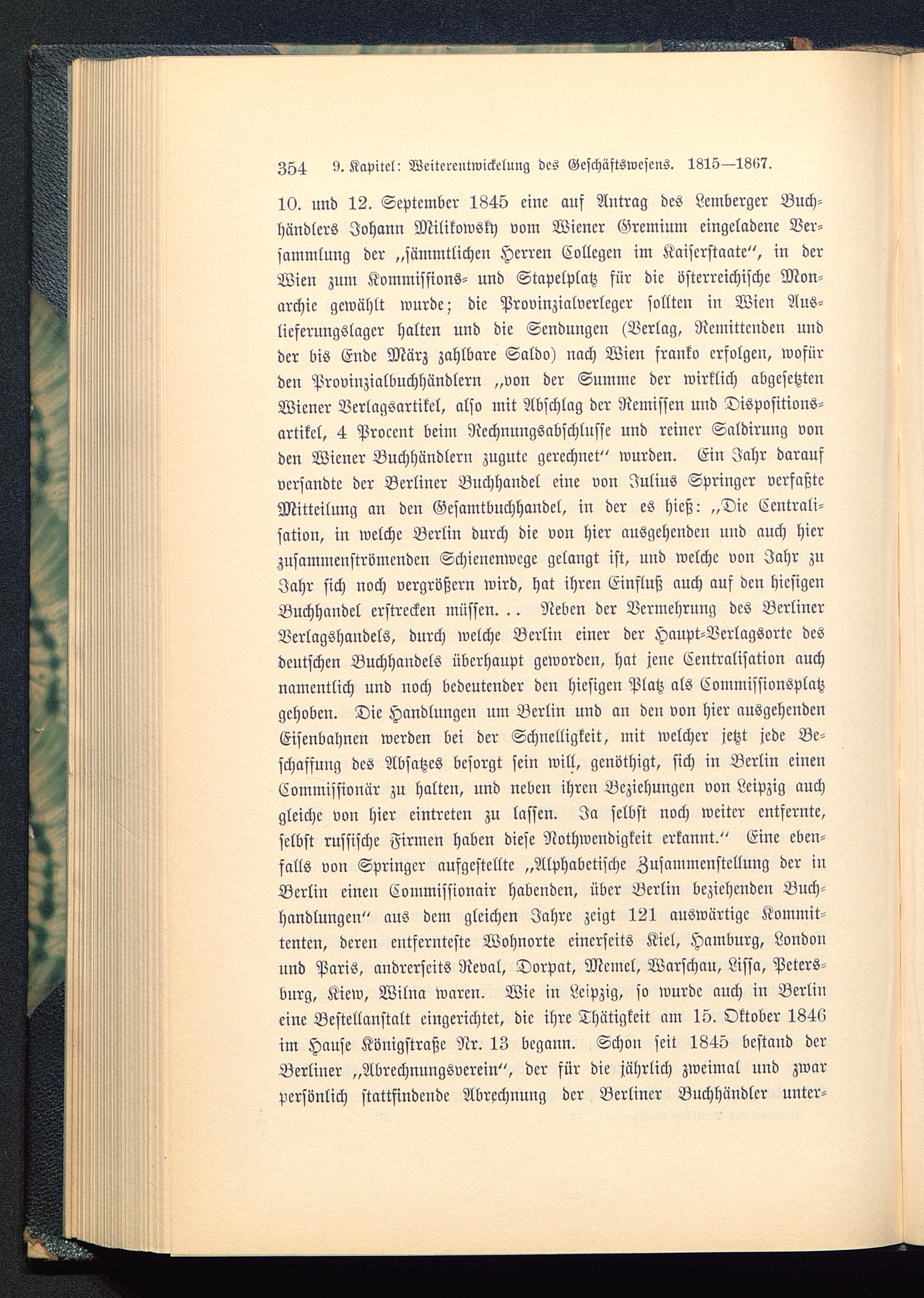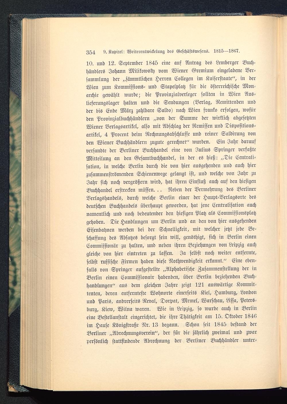 10. und 12. September 1845 eine auf Antrag des Lemberger Buch-händlers Johann Milikowsky vom Wiener Gremium eingeladene Ver-sammlung der „sämmtlichen Herren Collegen im Kaiserstaate", in derWien zum Kommissions- und Stapelplatz für die österreichische Mon-archie gewählt wurde; die Provinzialverlegcr sollten in Wien Aus-lieferungslager halten und die Sendungen (Verlag, Remittcnden undder bis Ende März zahlbare Saldo) nach Wien franko erfolgen, wofürden Provinzialbuchhändlcrn „von der Summe der wirklich abgesetztenWiener Verlagsartikcl, also mit Abschlag der Remissen und Dispositions-artikel, 4 Proccnt beim Rechnungsabschlüsse und reiner Saldirung vonden Wiener Buchhändlern zugute gerechnet" wurden. Ein Jahr daraufversandte der Berliner Buchhandel eine von Julius Springer verfaßteMitteilung an den Gesamtbuchhandel, in der es hieß: „Die Centrali-sation, in welche Berlin durch die von hier ausgehenden und auch hierzusammenströmenden Schienenwege gelangt ist, und welche von Jahr zuJahr sich noch vergrößern wird, hat ihren Einfluß auch auf den hiesigenBuchhandel erstrecken müssen. .. Neben der Vermehrung des Berliner Berlagshandels, durch welche Berlin einer der Haupt-Verlagsorte desdeutschen Buchhandels überhaupt geworden, hat jene Zentralisation auchnamentlich und noch bedeutender den hiesigen Platz als Commissionsplatzgehoben. Die Handlungen um Berlin und an den von hier ausgehendenEisenbahnen werden bei der Schnelligkeit, mit welcher jetzt jede Be-schaffung des Absatzes besorgt sein will, gcnöthigt, sich in Berlin einenEommissionür zu halten, und neben ihren Beziehungen von Leipzig auchgleiche von hier eintreten zu lassen. Ja selbst noch weiter entfernte,selbst russische Firmen haben diese Nothwendigkcit erkannt." Eine eben-salls von Springer aufgestellte „Alphabetische Zusammenstellung der inBerlin einen Commissionair habenden, über Berlin beziehenden Buch-handlungen" aus dem gleichen Jahre zeigt 121 auswärtige Kommit-tenten, deren entfernteste Wohnorte einerseits Kiel, Hamburg, London und Paris, andrerseits Reval, Dorpat, Mcmel, Warschau , Lissa, Peters-burg, Kiew, Wilna waren. Wie in Leipzig, so wurde auch in Berlin eine Bestellanstalt eingerichtet, die ihre Thtttigkcit nm 15. Oktober 184(>im Hause Königstraße Nr. 13 begann. Schon seit 1845 bestand derBerliner „Abrechnungsverein", der für die jährlich zweimal und zwarpersönlich stattfindende Abrechnung der Berliner Buchhändler unter-