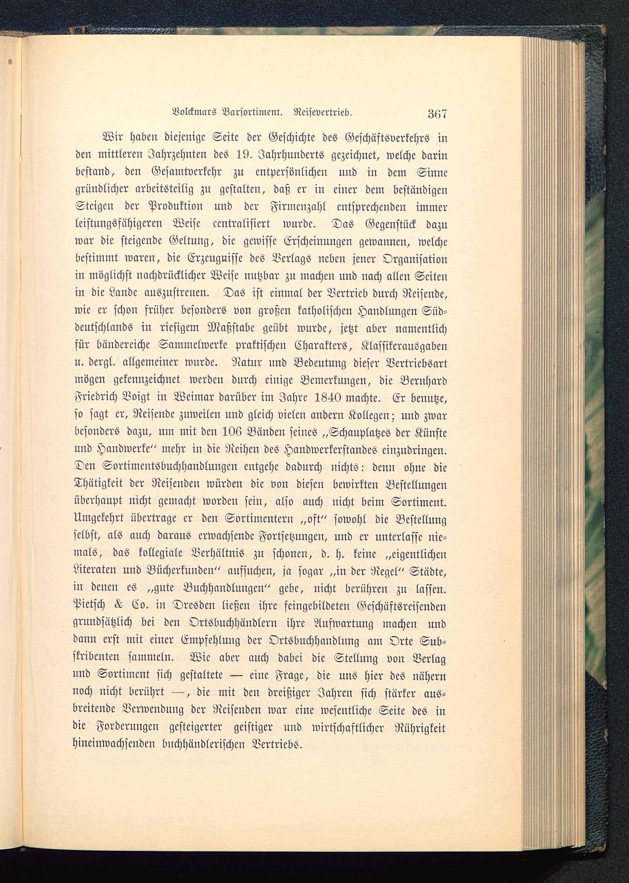 Wir haben diejenige Seite der Geschichte des Geschäftsverkehrs inden mittleren Jahrzehnten des 19. Jahrhunderts gezeichnet, welche darinbestand, den Gesamtvcrkchr zu entpersönlichen und in dem Sinnegründlicher arbeitsteilig zu gestalten, daß er in einer dem beständigenSteigen der Produktion und der Firmcnzahl entsprechenden immerleistungsfähigeren Weise ccntralisicrt wurde. Das Gegenstück dazuwar die steigende Geltung, die gewisse Erscheinungen gewannen, welchebestimmt waren, die Erzeugnisse des Verlags neben jener Organisationin möglichst nachdrücklicher Weise nutzbar zu machen und nach allen Seitenin die Lande auszustreuen. Das ist einmal der Vertrieb durch Reisende,wie er schon früher besonders von großen katholischen Handlungen Süd-dcutschlands in riesigem Maßstabe geübt wurde, jetzt aber namentlichfür bändereiche Sammelwerke praktischen Eharakters, Klassikerauögabeuu. dergl. allgemeiner wurde. Natur und Bedeutung dieser Vertriebsartmögen gekennzeichnet werden durch eiuige Bemerkungen, die BernhardFriedrich Voigt in Weimar darüber im Jahre 1840 machte. Er benutze,so sagt er, Reisende zuweilen und gleich vielen andern Kollegen; und zwarbesonders dazu, um mit den 106 Bänden seines „Schauplatzes der Künsteund Handwerke" mehr in die Reihen des Handwerkerstandes einzudringen.Den Sortimentsbuchhandluugcn entgehe dadurch nichts: denn ohne dieThätigkeit der Reisenden würden die von diesen bewirkten Bestellungenüberhaupt nicht gemacht worden sein, also auch nicht beim Sortiment.Umgekehrt übertrage er den Sortimentern „oft" sowohl die Bestellungselbst, als auch daraus erwachsende Fortsetzungen, und er unterlasse nie-mals, das kollegiale Verhältnis zu schonen, d. h. keine „eigentlichenLiteraten und Biichcrkunden" aufsuchen, ja sogar „in der Regel" Städte,in denen es „gute Buchhandlungen" gebe, nicht berühren zu lassen.Pietsch <K Co. in Dresden ließen ihre fcingcbildeten Geschäftsreisendengrundsätzlich bei den Ortsbuchhändlcrn ihre Aufwartung machen unddann erst mit einer Empfehlung der Ortsbuchhandlung am Orte Sub-skribenten sammeln. Wie aber auch dabei die Stellung von Verlagund Sortiment sich gestaltete — eine Frage, die uns hier des nähernnoch nicht berührt —, die mit den dreißiger Jahren sich stärker aus-breitende Verwendung der Reisenden war eine wesentliche Seite des indie Forderungen gesteigerter geistiger und wirtschaftlicher Rührigkeithineinwachsenden lmchhändlcrischcn Vertriebs.