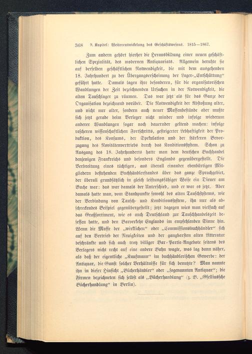 Zum andern gehört hierher die Herausbildung einer neuen geschäft-lichen Spezialitat, des modernen Antiquariats. Allgemein beruhte sieauf derselben geschäftlichen Notwendigkeit, die mit dem ausgehenden18. Jahrhundert zu der Übergangserscheinung der Lagcr-„Entschüttung"geführt hatte. Damals lagen ihre besonderen, für die organisatorischenWandlungen der Zeit bezeichnenden Ursachen in der Notwendigkeit, diealten Tauschlager zu räumen. Das war jetzt als für das Ganze derOrganisation bezeichnend vorüber. Die Notwendigkeit der Abstoßung alter,und nicht nur alter, sondern auch neuer Massenbestände aber mußtesich jetzt gerade beim Verleger nicht minder und infolge wiederumanderer Wandlungen sogar noch dauernder geltend machen: infolgerascheren wissenschaftlichen Fortschritts, gesteigerter Lebhaftigkeit der Pro-duktion, des Konsums, der Spekulation und der stärkeren Bevor-zugung des Novitätenvertriebs durch das Kouditionssystem. Schon zuAusgang des 18. Jahrhunderts hatte man dem deutscheil Buchhandeldenjenigen Frankreichs und besonders Englands gegenübergestellt. DieVerbreitung eines tüchtigen, aus überall einander ebenbürtigen Mit-gliedern bestehenden Buchhändlerstandcs über das ganze Sprachgebiet,der überall grundsätzlich in gleich leistungsfähiger Weise ein Diener amBuche war: das war damals der Unterschied, und er war es jetzt. Aberdamals hatte man, vom Standpunkte sowohl des alten Tauschsystems, wieder Verbindung von Tausch- und Konditionssystem, ihn nur als ab-schreckendes Beispiel gegenübergestellt; jetzt dagegen wies man vielfach aufdas Großsortiment, wie es anch Deutschland zur Tanschhandelszeit be-sessen hatte, nnd den Barverkehr Englands im empfehlenden Sinne hin.Wenn die Masse der „wirklichen" oder „Commissionsbuchhändler" sichauf den Bertrieb der Neuigkeiten und der gangbarsten alten Litteratnrbeschränkte und sich auch trotz billiger Bar-Partie-Angebote seitens desVerlegers nicht recht auf eine andere Bahn wagte, was lag dann näher,als daß der eigentliche „Kaufmann" im bnchhändlerischen Gewerbe: derAntiquar, die Gunst solcher Verhältnisse für sich benutzte ? Man nannteihn in dieser Hinsicht „Bücherhändler" oder „sogenannten Antiquar"; dieFirmen bezeichneten sich selbst als „Büchcrhandlung" lz. B. „GselliusschcBücherhandlung" in Berlin ).