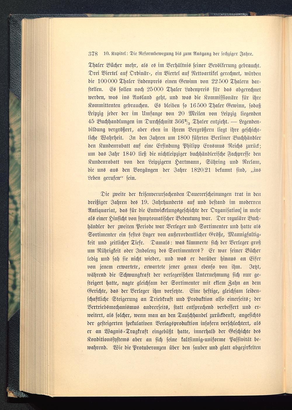 Thaler Bücher mehr, als es im Verhältnis seiner Bevölkerung gebraucht.Drei Viertel auf Ordinär-, ein Viertel auf Ncttoartikel gerechnet, würdendie 100000 Thalcr Ladenpreis einen Gewinn von 22500 Thalern dar-stellen. Es sollen noch 25000 Thaler Ladenpreis für das abgerechnetwerden, was ins Ausland geht, und was die Kommissionäre für ihreKommittenten gebrauchen. Es bleiben so 16500 Thaler Gewinn, sodaßLeipzig jeder der im Umfange von 20 Meilen von Leipzig liegenden45 Buchhandlungen im Durchschnitt 366^ Thaler entzieht. — Legcndcn-bildung vergrößert, aber eben in ihrem Vergrößern liegt ihre geschicht-liche Wahrheit. In den Jahren um 1800 führten Berliner Buchhändlerden Kundenrabatt auf eine Erfindung Philipp Erasmus Reichs zurück;um das Jahr 1840 ließ die nichtleipziger buchhändlerische Fachpresse denKundenrabatt von den Leipzigern Hartmann, Sühring und Reclam,die uns aus den Vorgängen der Jahre 1820 21 bekannt sind, „insLeben gerufen" sein.