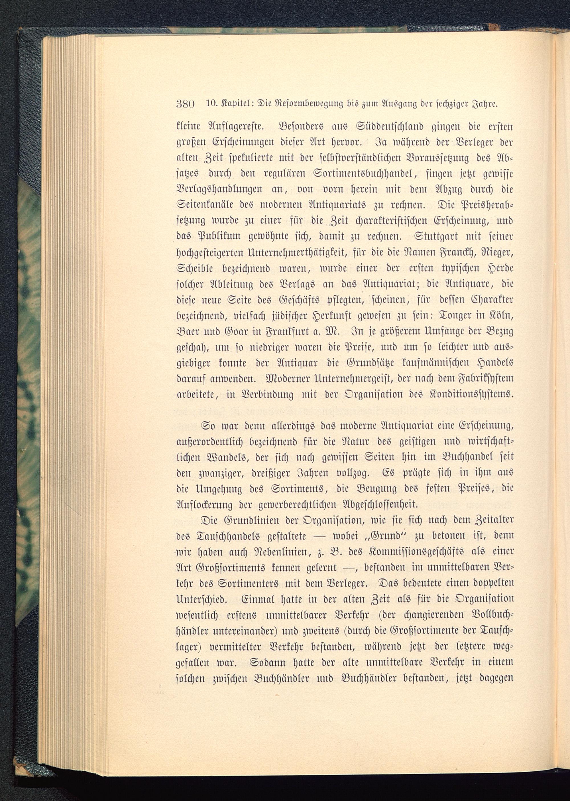 So war denn allerdings das moderne Antiquariat eine Erscheinung,außerordentlich bezeichnend für die Natur des geistigen und wirtschaft-lichen Wandels, der sich nach gewissen Seiten hin im Buchhandel seitden zwanziger, dreißiger Jahren vollzog. Es prägte sich in ihm ausdie Umgehung des Sortiments, die Beugung des festen Preises, dieAuslockerung der gewerberechtlichen Abgeschlossenheit.