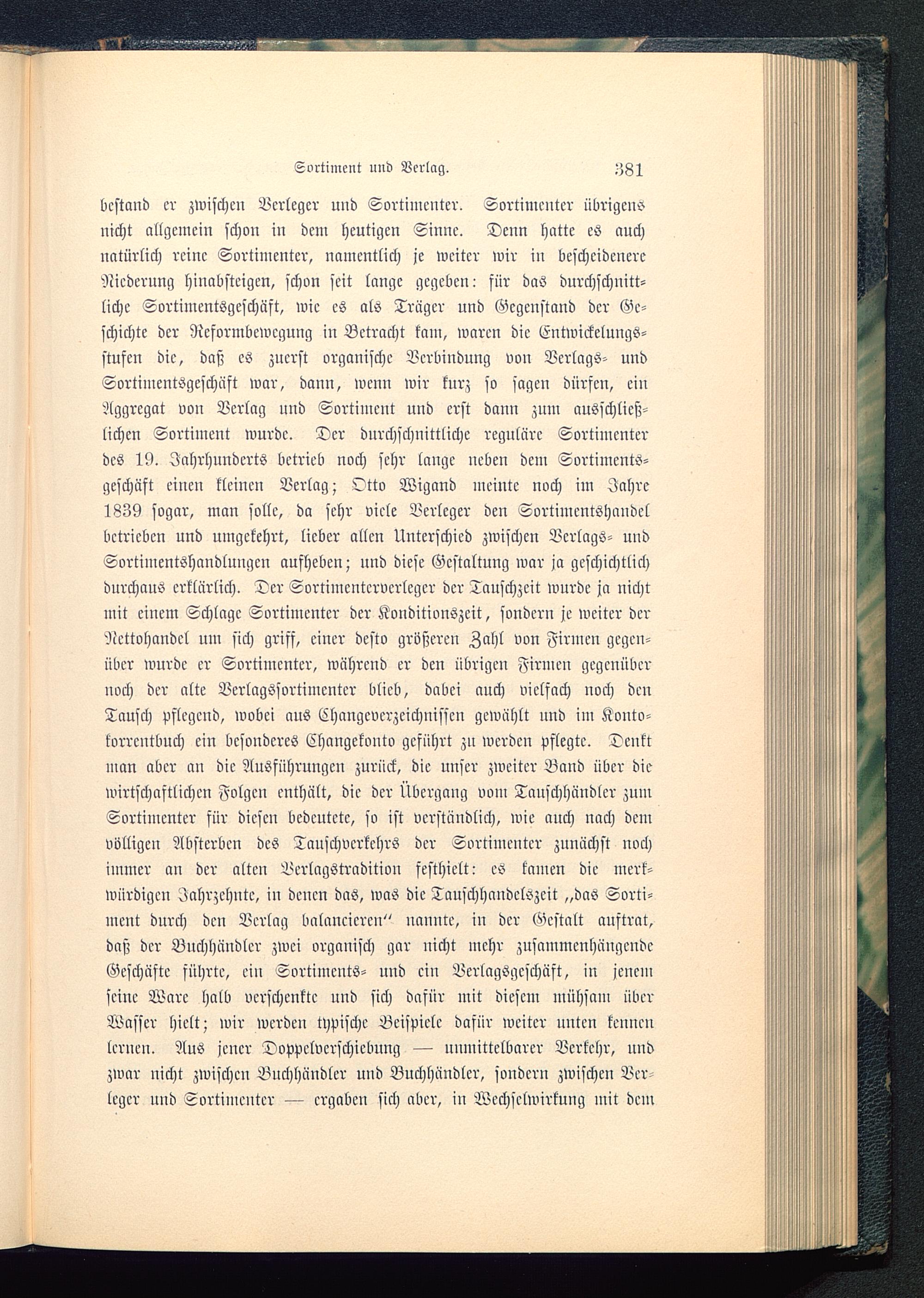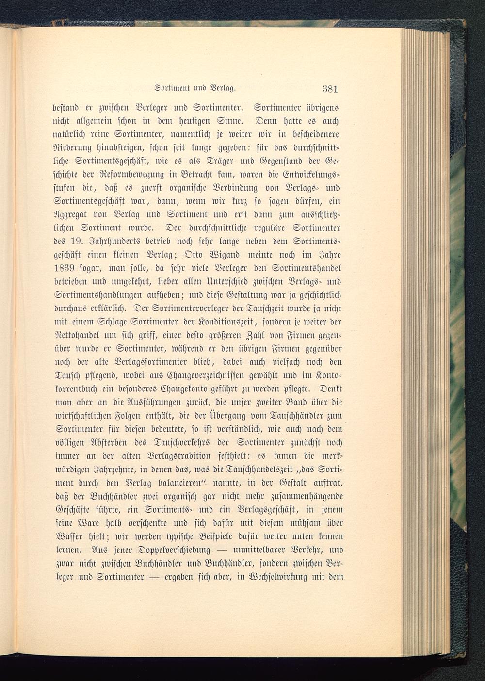 bestand er zwischen Verleger und Sortimcnter, Sortimcnter übrigensnicht allgemein schon in dem heutigen Sinne. Denn hatte es auchnatürlich reine Sortimcnter, namentlich je weiter wir in bescheidenereNiederung hinabsteigen, schon seit lange gegeben: für das durchschnitt-liche Sortimentsgeschäft, wie es als Träger und Gegenstand der Ge-schichte der Ncformbewcgung in Betracht kam, waren die Entwicklungs-stufen die, daß es zuerst organische Verbindung von Verlags- undSortimentsgeschäft war, dann, wenn wir kurz so sagen dürfen, einAggregat von Verlag und Sortiment und erst dann zum ausschließ-lichen Sortiment wurde. Der durchschnittliche reguläre Sortimenterdes 19. Jahrhunderts betrieb noch sehr lange neben dem Sortiments-geschäft einen kleinen Verlag; Otto Wigand meinte noch im Jahre1839 sogar, man solle, da sehr viele Verleger den Sortimcntshandelbetrieben und umgekehrt, lieber allen Unterschied zwischen Verlags- undSortimentshandluugcn aufheben; und diese Gestaltung war ja geschichtlichdurchaus erklärlich. Der Sortimentcrvcrlegcr der Tauschzeit wurde ja nichtmit einem Schlage Sortimenter der Konditionszcit, sondern je weiter derNcttohandcl um sich griff, einer desto größeren Zahl von Firmen gegen-über wurde er Sortimcnter, während er den übrigen Firmen gegenübernoch dcr alte Verlagssortimcntcr blieb, dabei anch vielfach noch denTausch pslcgend, wobei aus Changevcrzcichnisscn gewählt und im Kouto-korrcntbuch ein besonderes Changekonto geführt zn werden pflegte. Denktman aber an die Ausführungen zurück, die unser zweiter Band über diewirtschaftlichen Folgen enthält, die der Übergang vom Tauschhändlcr zumSortimcnter für dicscn bedcutctc, so ist verständlich, wie auch nach demvölligen Absterben des Tauschvcrkchrs dcr Sortimentcr zunächst nochimmer an der alten Verlagstradition festhielt: es kamen die merk-würdigen Jahrzehnte, in denen das, was die Tauschhnndclszcit „das Sorti-ment durch dcn Verlag balancieren" nannte, in der Gestalt auftrat,daß dcr Buchhändler zwei organisch gar nicht mehr zusammenhängcndcGeschäfte' führte, ein Sortiments- und ein Vcrlagsgcschäft, in jenemseine Warc halb verschenkte und sich dafür mit diesem mühsam überWasser hielt; wir werden typische Beispiele dafür weiter unten kcnncnlcrncn. Aus jener Doppclverschicbung — unmittelbarer Verkehr, undzwar nicht zwischen Buchhändler und Buchhändler, sondern zwischen Ver-leger und Sortimcnter — ergaben sich aber, in Wechselwirkung mit dein