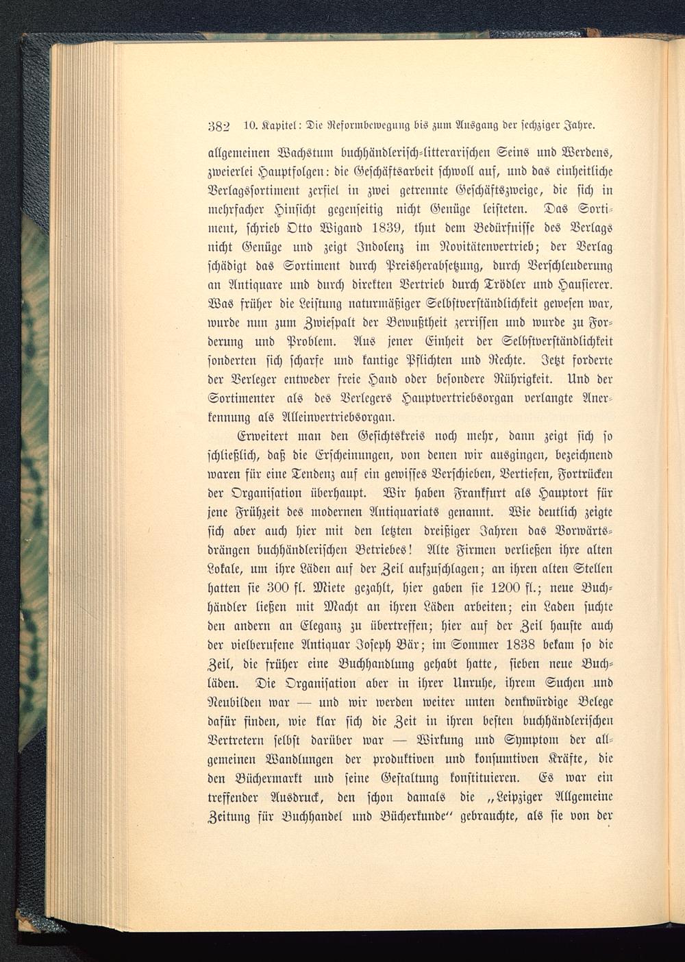 Erweitert man den Gesichtskreis noch mehr, dann zeigt sich soschließlich, daß die Erscheinungen, von denen wir ausgingen, bezeichnendwaren für eine Tendenz auf ein gewisses Verschieben, Vertiefen, Fortrückender Organisation überhaupt. Wir haben Frankfurt als Hauptort fürjene Frühzeit des modernen Antiquariats genannt. Wie deutlich zeigtesich aber auch hier mit den letzten dreißiger Jahren das Borwärts-drüngcn buchhändlerischcn Betriebes! Alte Firmen verließen ihre altenLokale, um ihre Läden auf der Zeil aufzuschlagen; an ihren alten Stellenhatten sie 300 fl. Miete gezahlt, hier gaben sie 1200 fl.; neue Buch-händler ließen mit Macht an ihren Lüden arbeiten; ein Laden suchteden andern an Eleganz zu übertreffen; hier auf der Zeil hauste auchder viclberufene Antiquar Joseph Bär ; im Sommer 1838 bekam so dieZeil, die früher eine Buchhandlung gehabt hatte, sieben neue Buch-lüdcn. Die Organisation aber in ihrer Unruhe, ihrem Suche» undNeubildeu war — und wir werden weiter unten denkwürdige Belegedafür finden, wie klar sich die Zeit in ihren besten buchhändlerischenVertretern selbst darüber war — Wirkung und Symptom der all-gemeinen Wandlungen der produktiven und konsumtiven Kräfte, dieden Büchermarkt und seine Gestaltung konstituieren. Es war eintreffender Ausdruck, den schon damals die „Leipziger AllgemeineZeitung für Buchhandel und Bücherkunde" gebrauchte, als sie von der