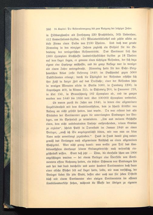 in Hildburghauscn als Fortsetzung 220 Prachtbibcln, 365 Universum,412 Konversations-Lcxikon, 671 Miniaturbibliothck und zahlte allein andiese Firma einen Saldo von 2100 Thalcrn. Und doch war geradeFlcmining in den vierziger Jahren zugleich ein Beispiel für die Be-deutung des verlegerischeu Nciscvertriebs. Das Sortiment ließ ihm1800 Exemplare Kirchhoffs landwirtschaftliches Lexikon zu 18 Thaleruauf dem Lager liegen, er gewann einen tüchtigen Reisenden, der sich dazueigens eine Equipage anschaffte, und die ganze Auflage war in wenigerals einem Jahre untergebracht. Flcmming hatte für den Sohr-Bcrg-hausschcn Atlas (erste Lieferung 1840) im Buchhandel gegen 5000Subskribenten erlangt; durch die Thätigkeit der Reisenden erhöhte sichihre Zahl in kurzer Zeit auf das Dreifache; einer der Reisenden setztein wenigen Monaten allein in Berlin 1000, in Hamburg 1200, inKopenhagen 400, in Altona 315, in Schleswig 20«), in Hannover 218,in Kiel 150, in Brannschweig 182 Exemplare ab, und im ganzenwurden von 1840 bis 1850 weit über 100000 Exemplare verbreitet.