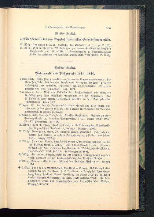 Schweis chke, Gust., Ooäsx nunäinarius Osrraaliias Iitsrs,ts,s oontimmtus. DerMeß-Jahrbücher des deutschen Buchhandels Fortsetzung die Jahre 1766 biseinschließlich 1816 umfassend. (Bearbeitet von Ed. Brinckmeier.) Mit einemVorwort von Gust. Schwctschke. Halle 1877.Faulmann , Karl, Illustrierte Geschichte der Buchdruckerkunst mit besondererBerücksichtigung ihrer technischen Entwicklung bis zur Gegenwart. Mit14 Tafeln in Farbendruck, 12 Beilagen und 380 in den Text gedrucktenIllustrationen. Wien 1382.Berg er, Ed., der deutsche Buchhandel in seiner Entwicklung u. in seinen Ein-richtungen in den Jahren 1815 bis 1867: Archiv für Geschichte des DeutschenBuchhandels, II (1879), S. 125 fg.Schmidt, Rnd., Deutsche Buchhändler, Deutsche Buchdrucker. Beiträge zu einerFirmengeschichte des deutscheu Buchgewerbes, I—III, Berlin 1902—1905;IV—VI, Eberswalde 1907, 03.S. 199fg.: Goebel, Theod., Friedrich Koenig u. die Erfindung der Schnellpresse.