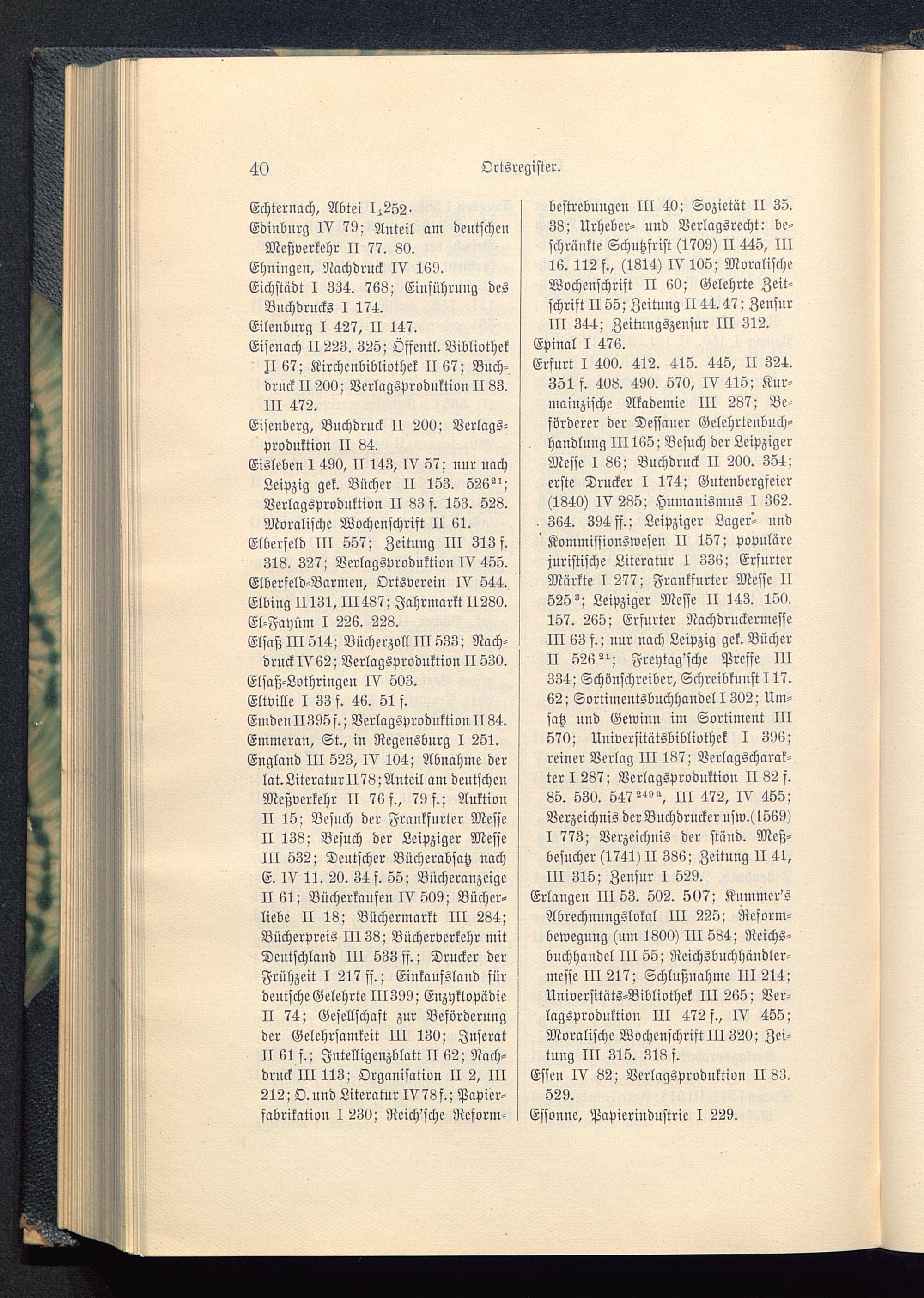 Erlangen III 53. 502. 507; Knmmer'sAbrechnungslokal III 225; Reform-bcwegung (um 1800) III 584; Rcichs-buchhaudel III 55; Reichsbuchhändlcr-messe III 217; Schlnßnahme III 214;Universitäts-Bibliothck III 265; Ver-lagsproduktion III 472 f., IV 455;Moralische Wochenschrift III 320; Zei-tung III 315. 318 f.