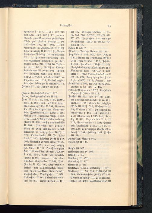 Jena II 147. 149. 324. 344 f. 350 f.,III 414. 489 f. 536, IV 10; Leipziger Auslieferung (1704) II 294; Bedenkendie Rcchtswidrigtcit des Nachdrucksbetr. (Juristenfakultät, 1722) I 746;Besuch der Frankfurter Messe I 669.° 773, II 525°; Bücherauktiousordnung(1683) II 328; deutsch und lateinischII 391; Eintreffen zur LeipzigerMesse II 265; Insinuation kaiscrl.Privilegs in Leipzig (um 1610) II172; Kontanthandel III 55; Lohn-druck II 200; Leipziger Messe I1149.265; Nachdruck zwischen Jenaer Buch-druckern II 428; nur nach Leipzig gek. Bücher II 154; Opposition gegenkaiserl. Kommission (Lencht 1608/09)I 622. 624 f. 634; pro noviwts(1620) II 285; Signet I 825; Sta-ttstisches: Buchdrucker II 351, Buch-händler II 351. 387, Disp.-Händler,Schrift- und Fignrschncider, Künst-und Disp.-Händler, Kupfcrdruckcr,Kupferstecher, Schriftgießer II 351;Universität II 86; Universitätsbiblio-thek III 267; reiner Verlag II 447,