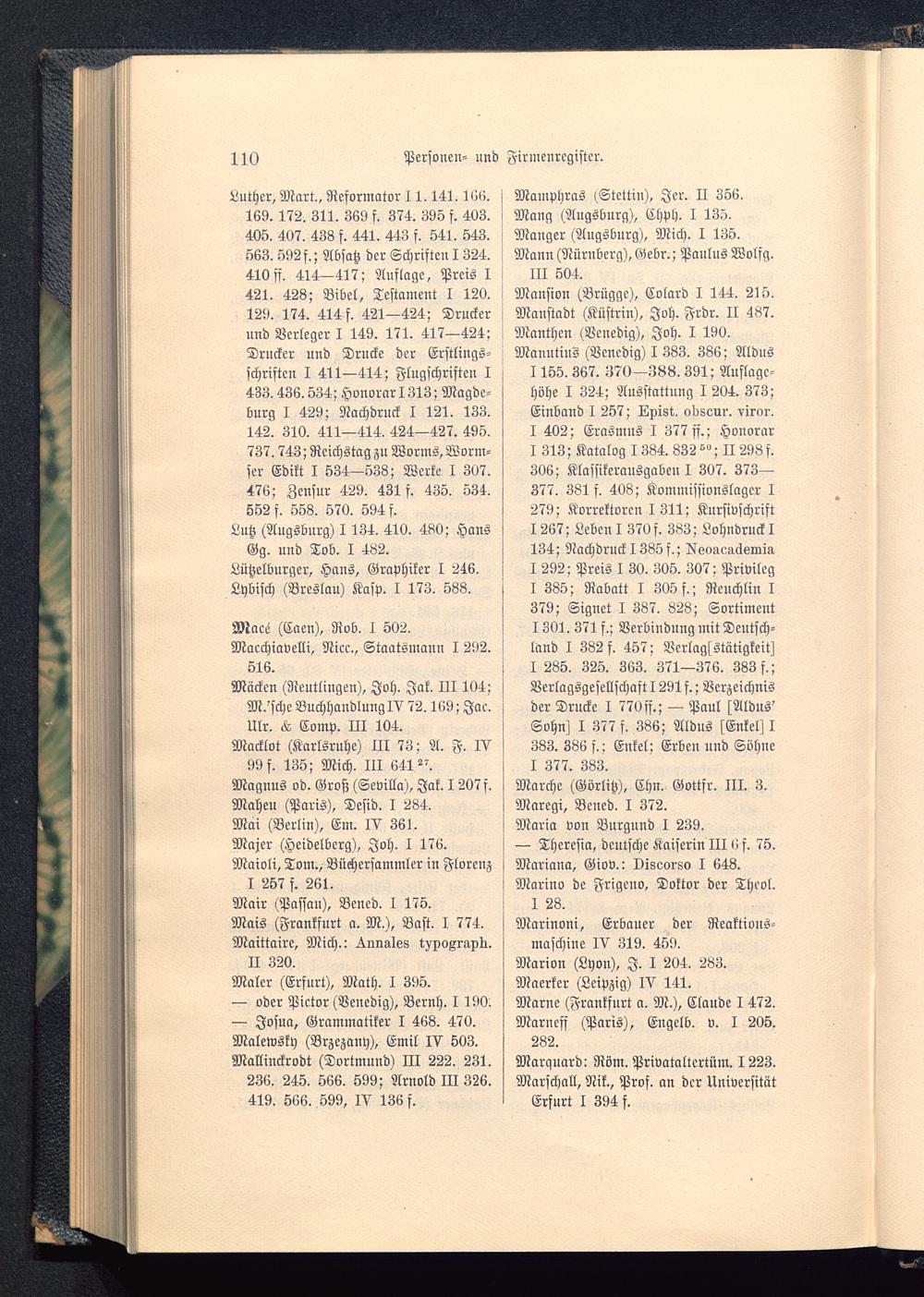 M-msion ^Brügge ), Colard I 144. 215.j Manstadt (Küstrin ), Joh. Frdr. II 487.l Manchen (Venedig), Joh . I 190.! Manntius (Venedig) I 333. 386; Aldns1155.367. 370—388.391; Auflage-höhe I 324; Ausstattung I 204. 373;Einband I 257; IZpi8t, obseur. viror.I 402; Erasmus I 377 ff.; HonorarI 313; Katalog 1334. 832 °°; II 298 f.306; Klassikerausgabeu I 307. 373—377. 381 f. 408; Kommissionslager I279; Korrektoren 1311; Kursivschrift1267; Lebcu l 370f. 383; Lohndruck I134; Nachdruck 1385f.; NgoaeacksraiaI 292; Preis I 30. 305. 307; PrivilegI 385; Rabatt I 305 f.; Reuchlin I379; Signet I 387. 828; Sortiment1301. 371 f.; Verbindung mit Deutsch-land I 382 f. 457; VerlagsstätigkeitZI 285. 325. 363. 371—376. 383 f.;Verlagsgesellschaft 1291 f.; Verzeichnisder Drucke I 77»sf.; — Paul ^Aldus'Sohn) I 377 f. 386; Aldus sEnkelZ I383. 386 f.; Enkel; Erben und SohneI 377. 333.