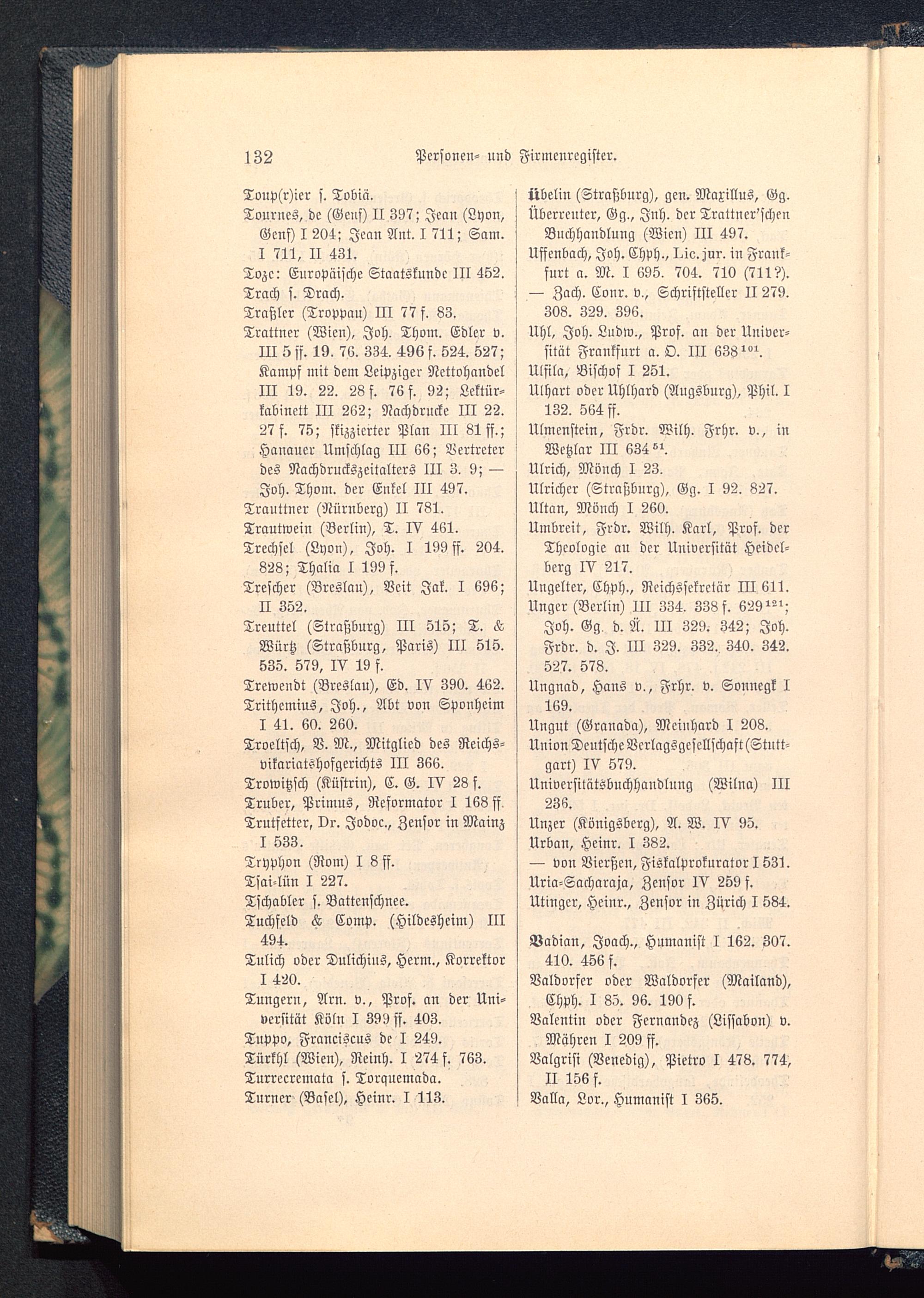 Trattner (Wien ), Joh. Thom. Edler v.III 5 sf. 19. 76. 334. 496 f. S24. 527;Kampf mit dem Leipziger NettohandelIII 19. 22. 28 f. 76 f. 92; Lektür-kabinctt III 262; Nachdrucke III 22.27 f. 75; skizzierter Plan Hl 81 ff.;Hanauer Umschlag III 66; Vertreterdes Nachdruckszcitaltcrs III 3. 9; —Joh. Thom. der Enkel III 497.