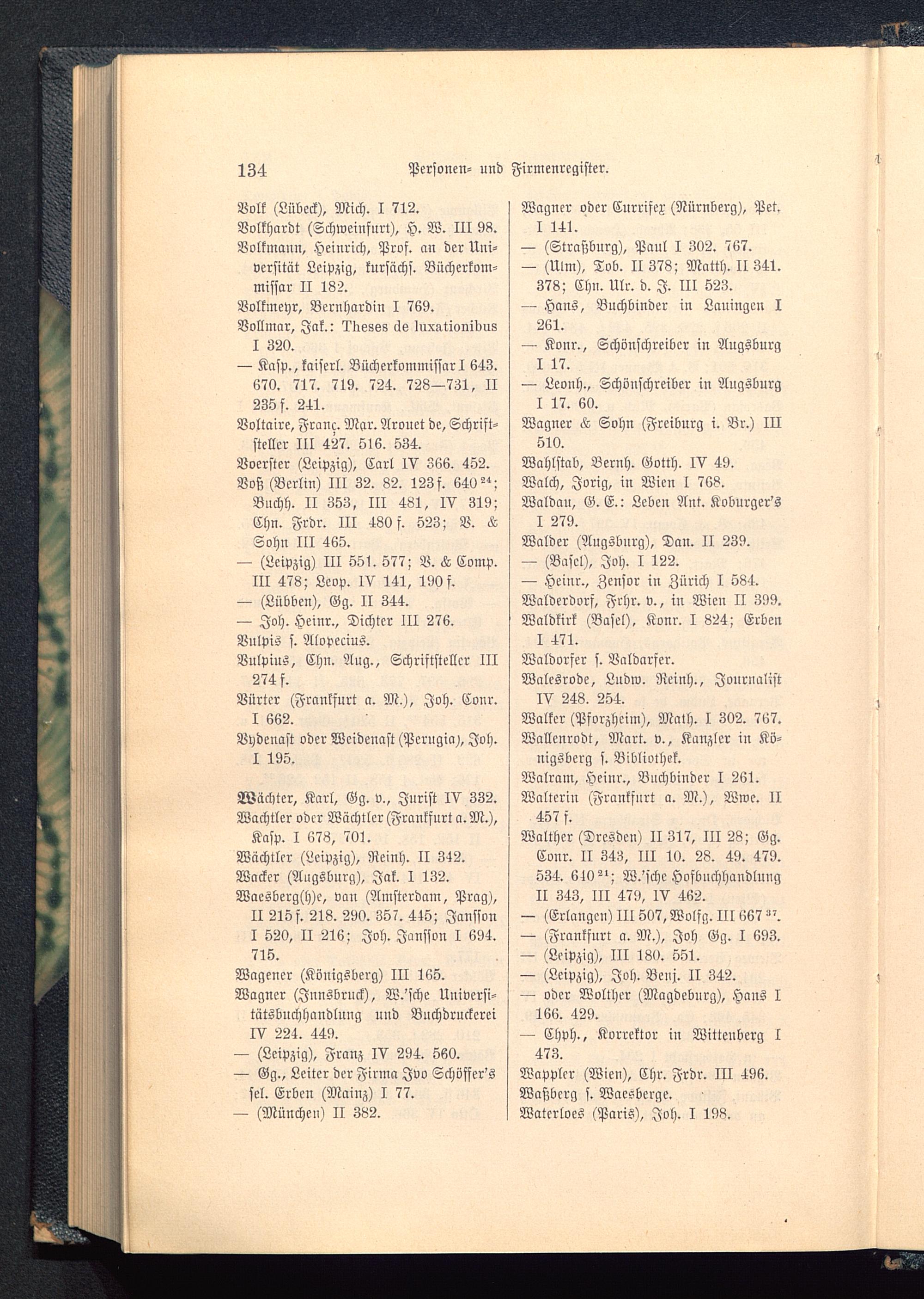 Kasp. I 678, 701.Wächtler (Leipzig ), Reinh. II 312.Wacker (Augsburg ), Jak. I 132.Waesberg(h)e, Vau (Amsterdam, Prag ),