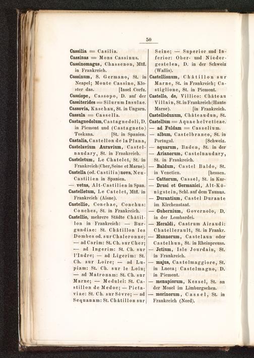Castellio, mehrere Städte Chätil-lon in Frankreich: — Bur-gund i a e: St. C h ä t i 11 o n 1 e sDombes od. surChalerönne;•— ad Carim: St. Ch. sur Cher ;■— ad Ingerim: St. Ch. surl'Indre; — ad Ligerim: St.Ch. sur Loire; — ad Lu-piani: St. Ch. sur le Loin;— ad Matronara: St. Ch. surMarne ; — Medulci: St. Ca-stillon de Medoc; — Picta-viae: St. Ch. surSevre;— adSequanam: St. Chätillon sur