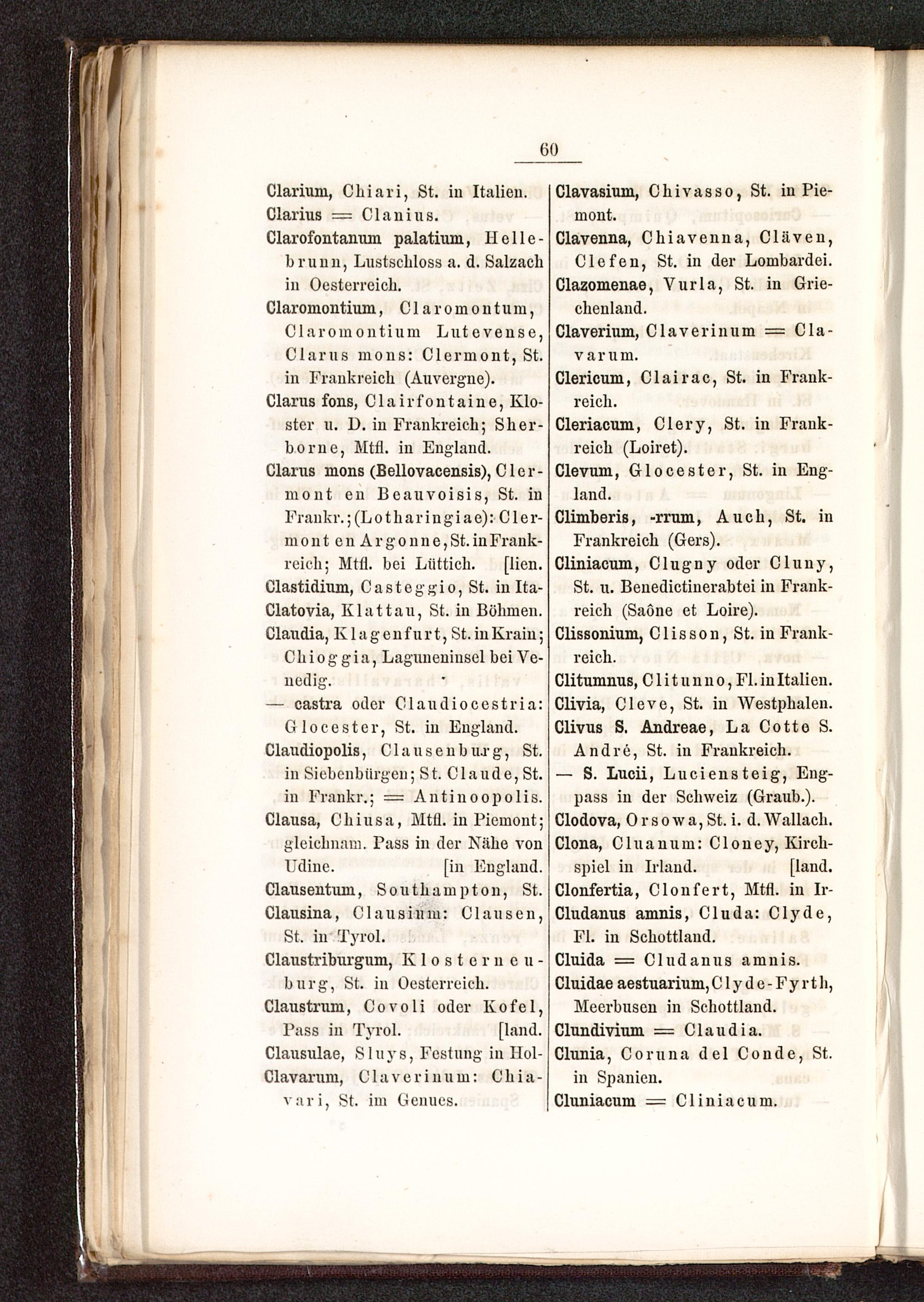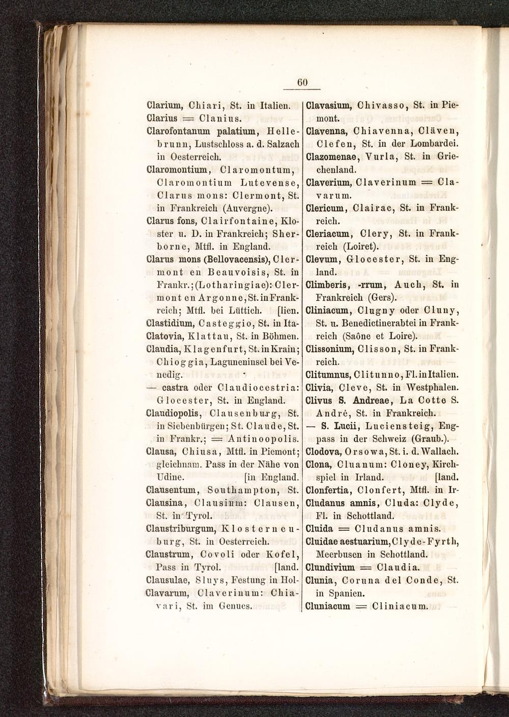 Clarus mons (Bellovacensis), Cler-mont en Beauvoisis, St. inFrankr. ; (L o t h a r i n g i a e): C1 e r-mont e n A r g o n n e, St. in Frank-reich ; Mtfl. bei Lüttich. [lien.